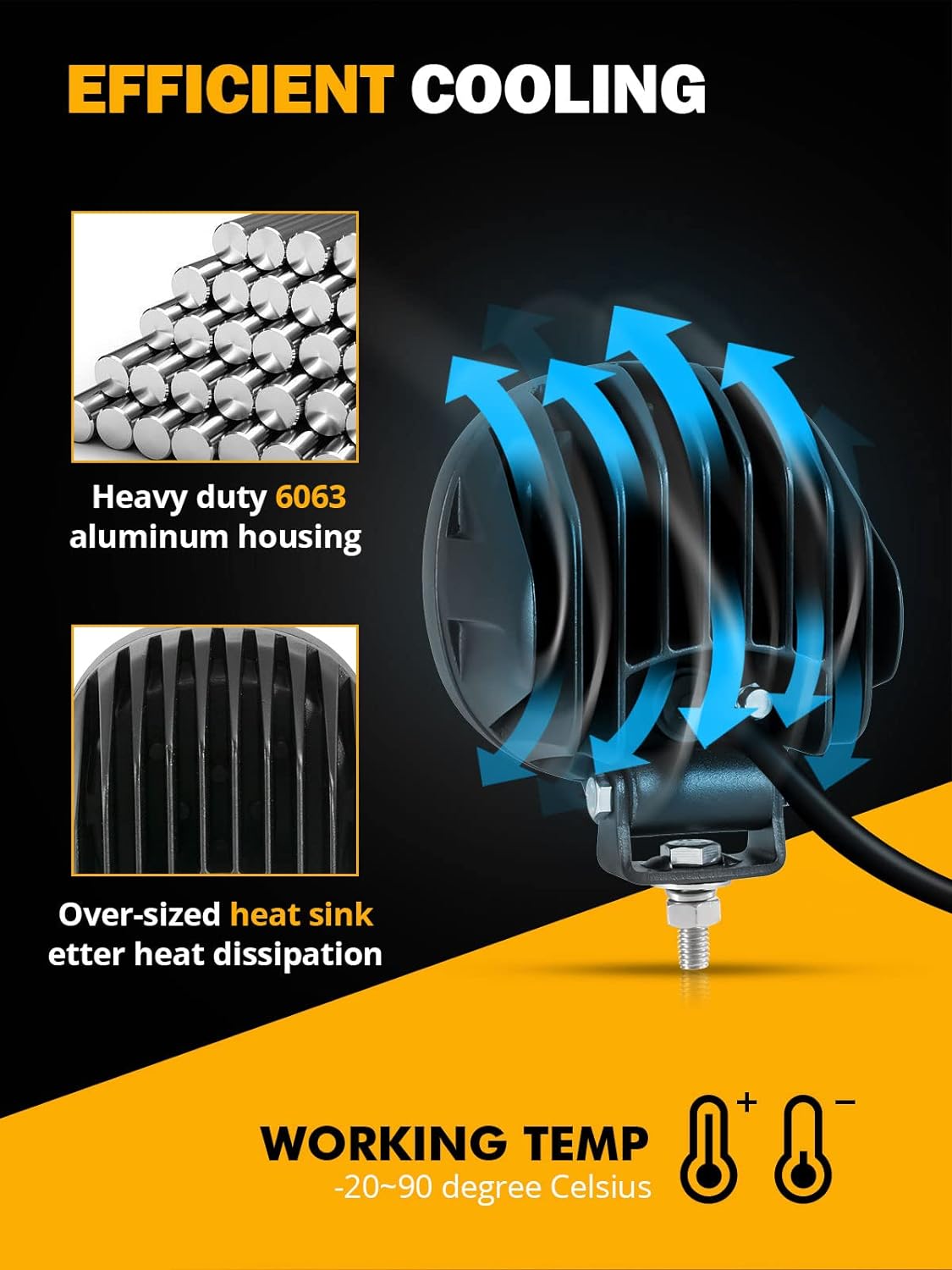 - 【INCREDIBLE BRIGHTNESS】Auxbeam 4 inch 90W LED offroad lights are equipped with 9 pieces high efficiency 3535 LED chipsets and produce up to 9000LM of brilliant light, 300% brighter than your stock light. Allows you to see the left and right clearly anytime.