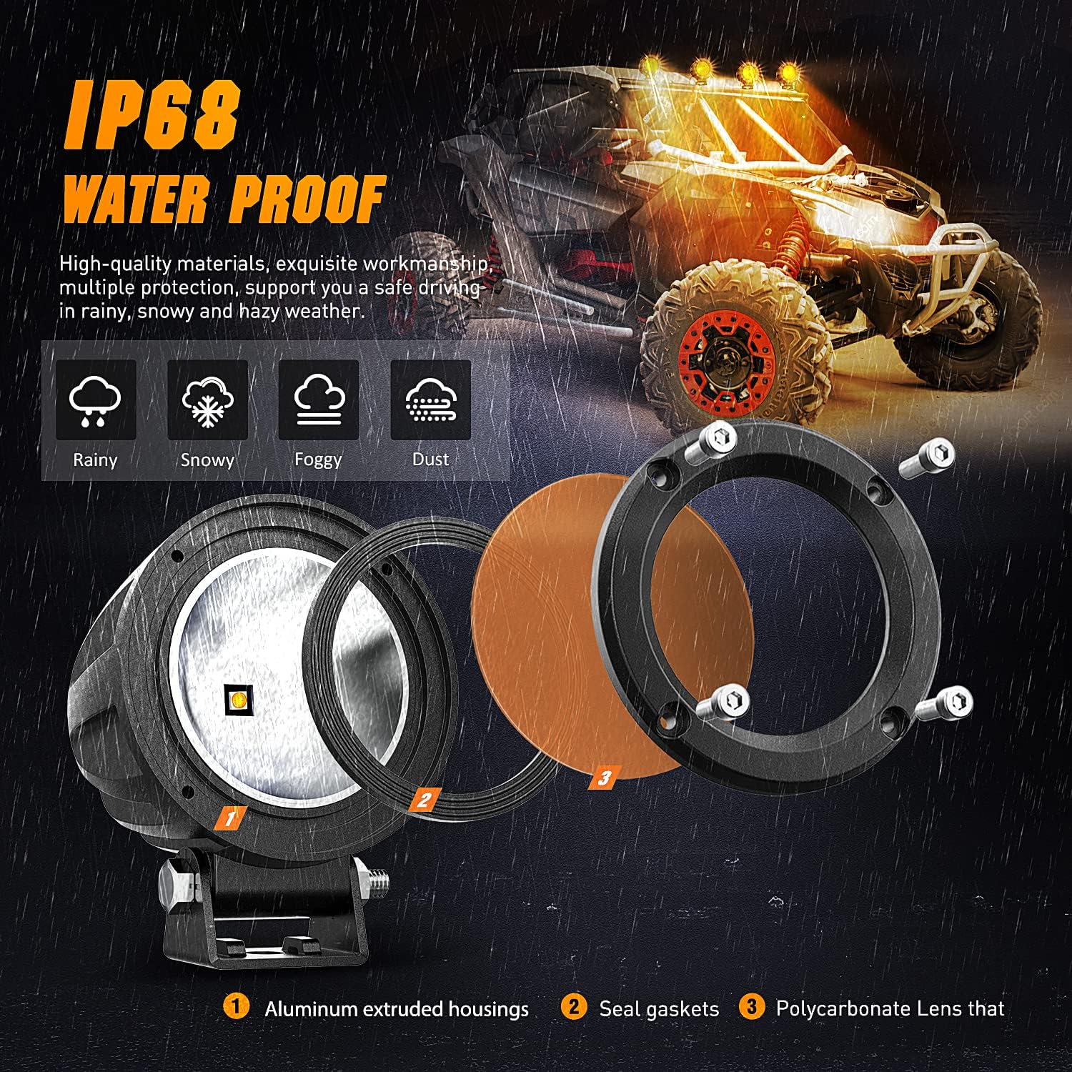 - 【High Quality】: Built in IP68 waterproof, powerful to withstand any harsh environments and weather conditions. Also lights are built-in EMC for EMI/RFI protection, resolve the issue of radio interference and flickering