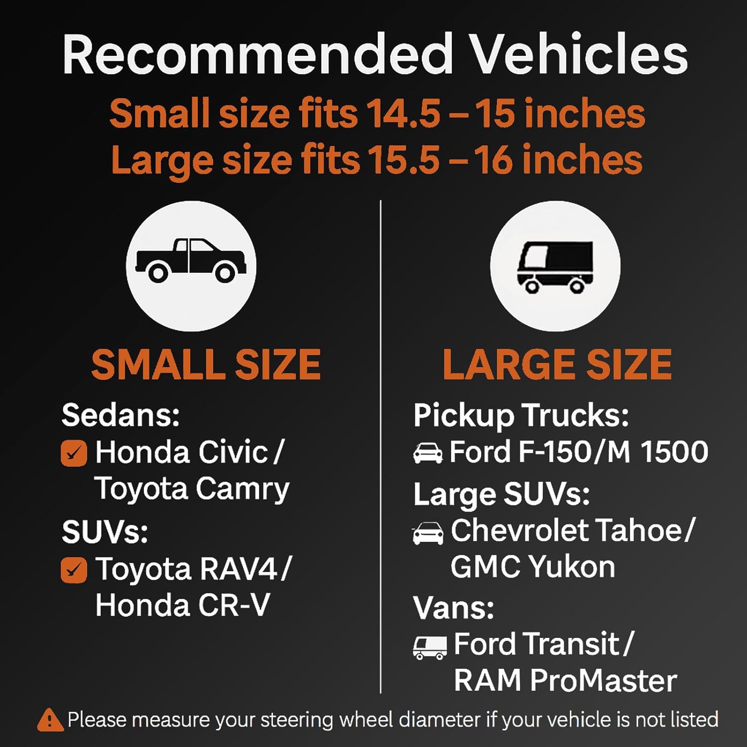 - FITS LARGE STEERING WHEELS–SIZE GUIDE INCLUDED: This HOTOR leather steering wheel cover is designed for large-size steering wheels (15.5–16.0 inches ). It fits full-size pickup trucks, large SUVs, and commercial vans, such as Ford F-150, RAM 1500, Chevrolet Tahoe, and Ford Transit.Before ordering, we strongly recommend measuring your steering wheel diameter to ensure the correct size selection