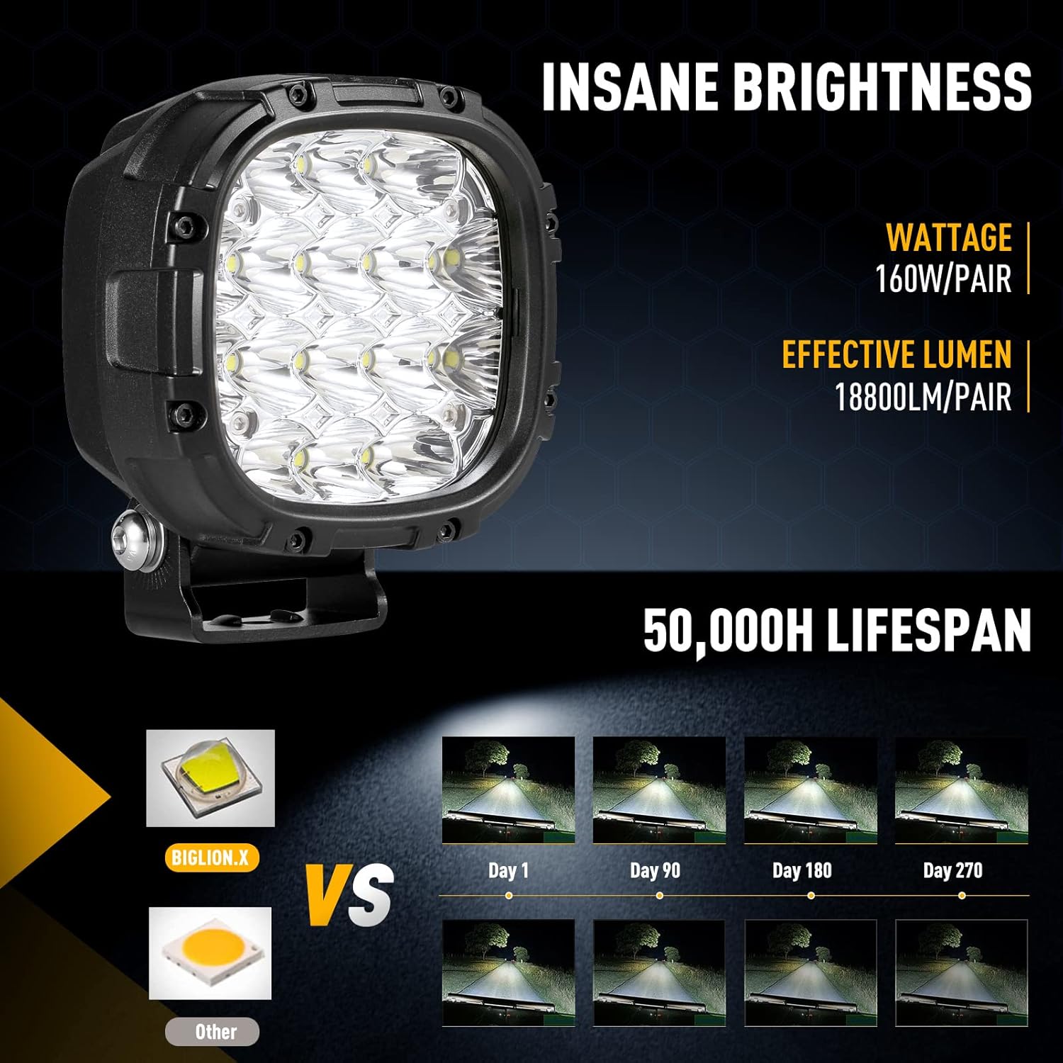- Led white driving lights use premium high temperature resistance electronics elements to form high usage circuit, include IC, capacitance and inductance etc. reduce heat generation to make the light bar’s lifespan more than 50,000 hours. Meet EMC anti-interference standard. Spot lights can work normally between -40 degree Celsius ~ 150 degree Celsius.