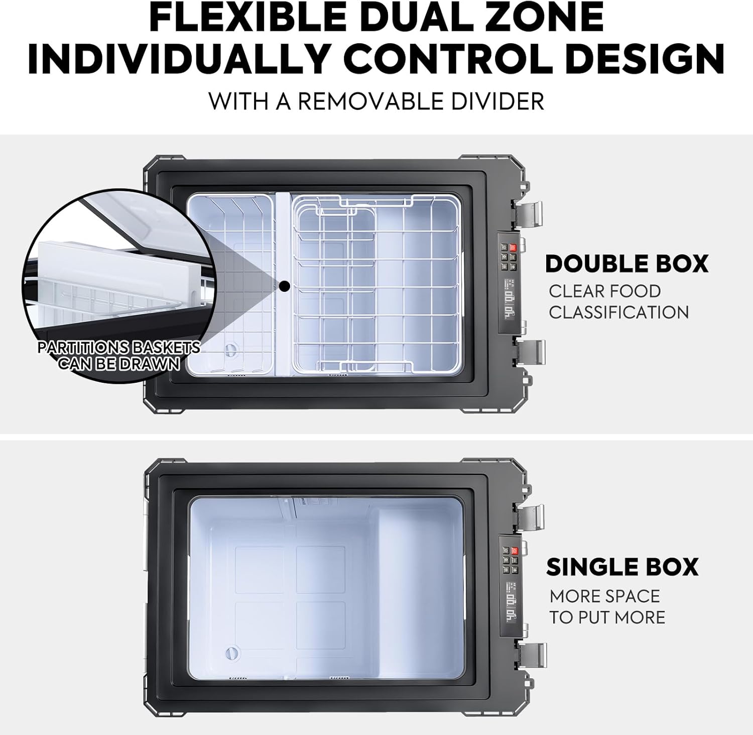 - [Flexible Dual Zone Design] The APL55 add removable divider design that allows automatic switching between single and dual zone mode by removing the partition, providing 2 separate zones for refrigeration and freezing with 2 independent digital controller.