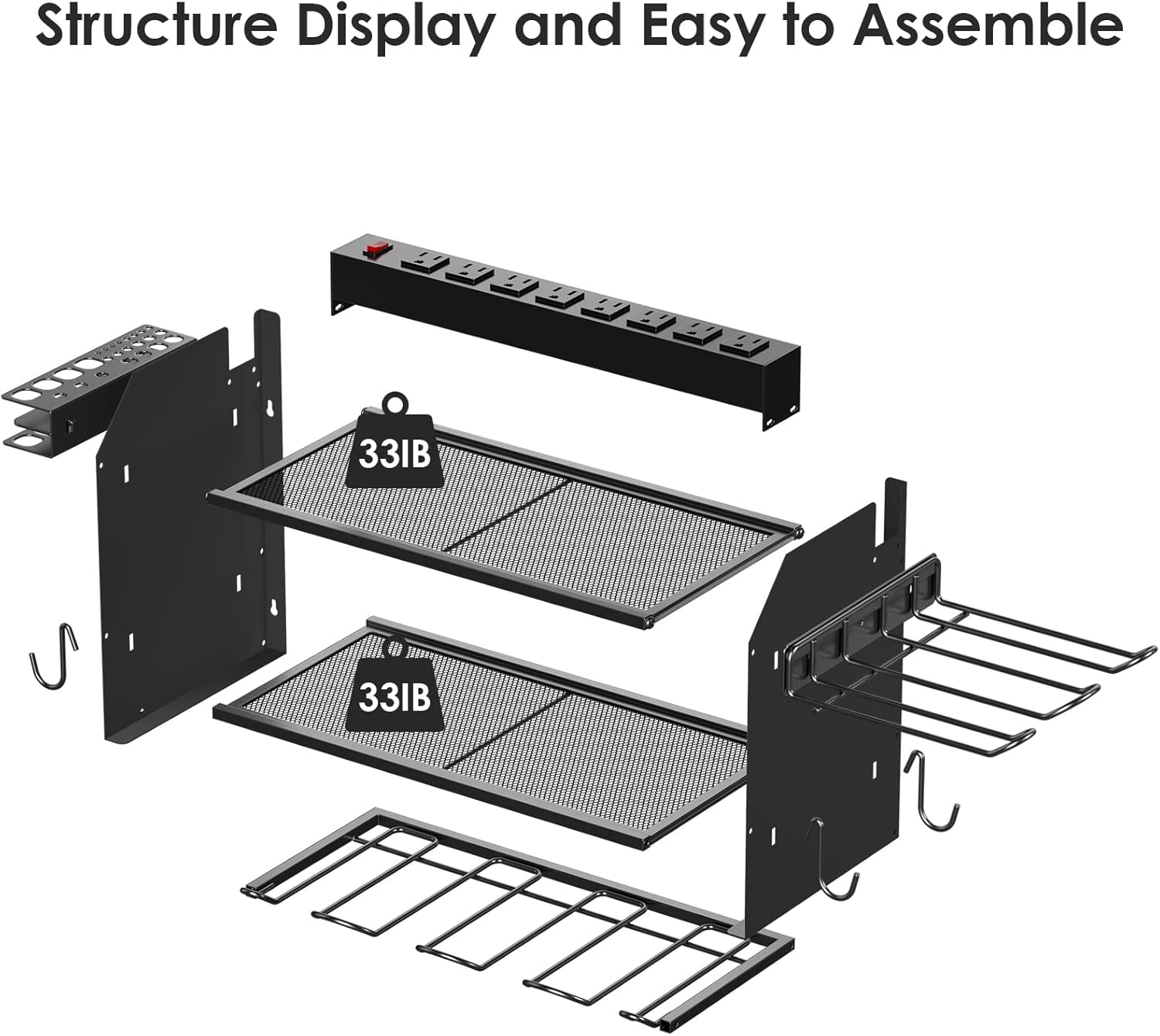- Easy to assemble and mount on a peg board, If you need more storage space, you can connect the two shelves (or more) by screws. Each layer of the grid can support a maximum weight of 33IB. Made from heavy gauge steel.