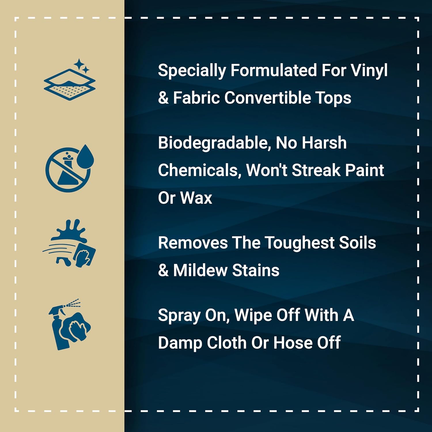 - BIODEGRADABLE FORMULA WON’T STREAK PAINT – Topless Sauce is environmentally friendly and contains no harsh chemicals or bleach so in addition to being safe for convertible tops, it will not damage paint, strip wax or leave unsightly residue.