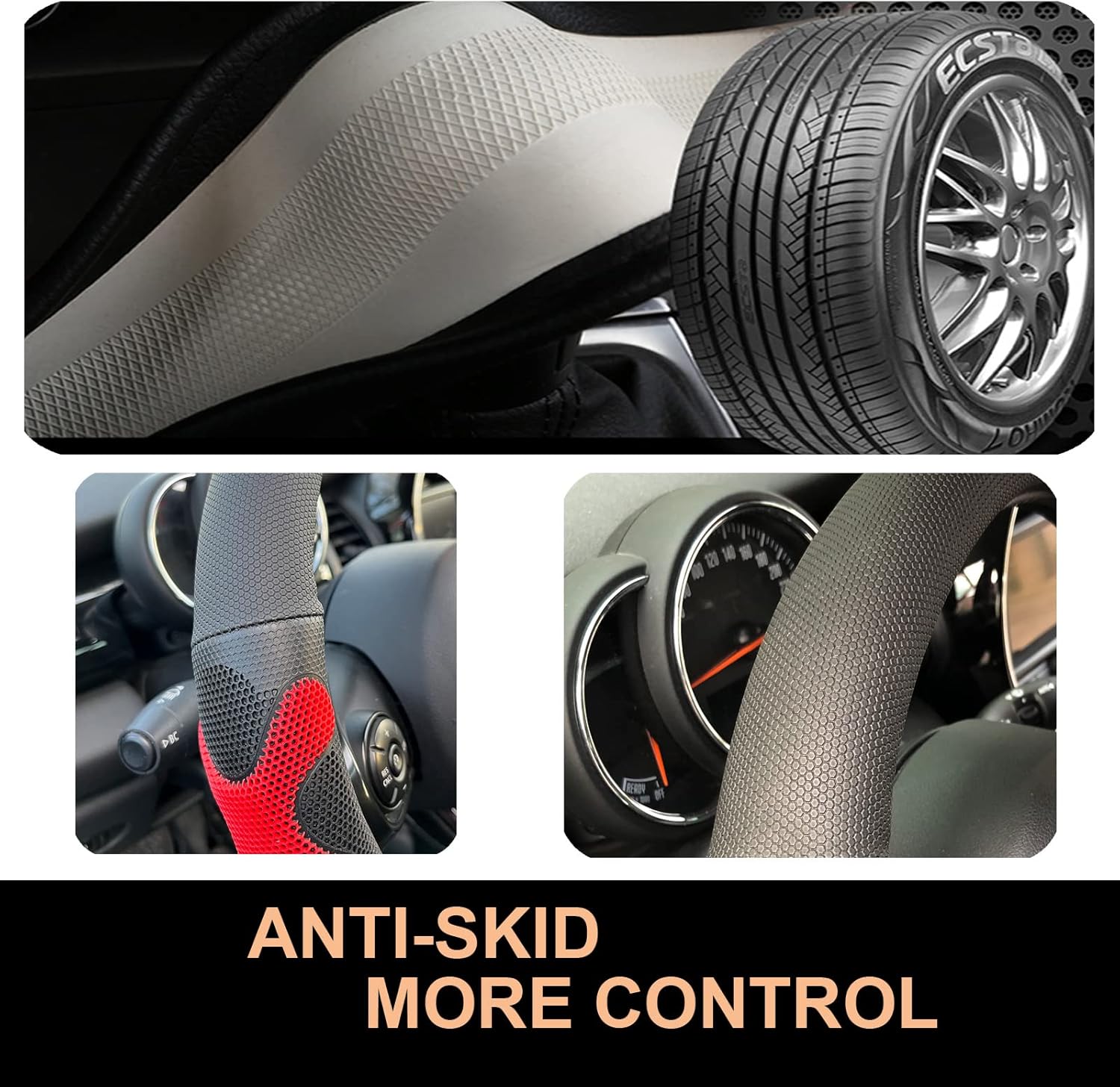 - Built to Last: Crafted with a solid rubber inner circle, textured microleather leather, and a 3D honeycomb silicone grip, this cover boasts a unique material combination that ensures exceptional durability. The silicone grip effectively relieving sweaty hands under hot weather. Enjoy a long-lasting and comfortable grip with PINCTROT car steering wheel cover.