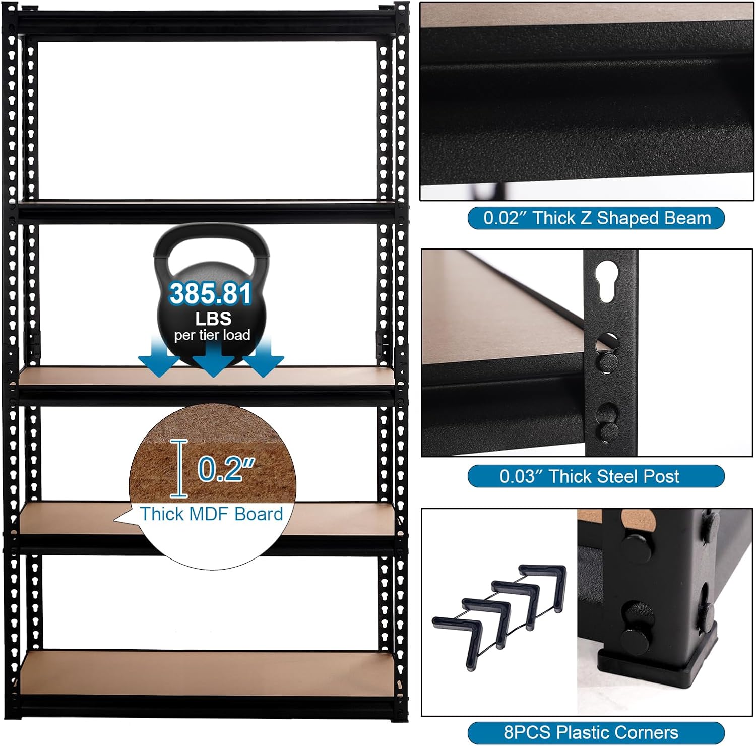 - WIDE SIZE& HEAVY DUTY: Measuring 35.43"W x 15.75"D x 72"H, this versatile shelving unit provides abundant space to neatly stow away tools, supplies and equipment. Each shelf can hold up to 385.81lbs, with a total bearing capacity of 1929.05lbs, the 5 tier heavy duty storage shelves in black has been designed to store heavy loads making it ideal for tool storage or storage within the garages,utility rooms and workshops.