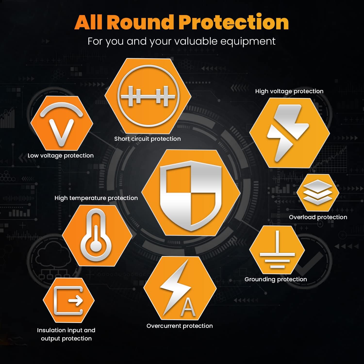 - ☀[Protect your equipment] Perfect safety protection: over voltage, low voltage, overload, short circuit, overheat, reverse polarity protection (fuse). Auto restart function and GND leakage protection (lightning strike). Product liability is assumed by AIG.