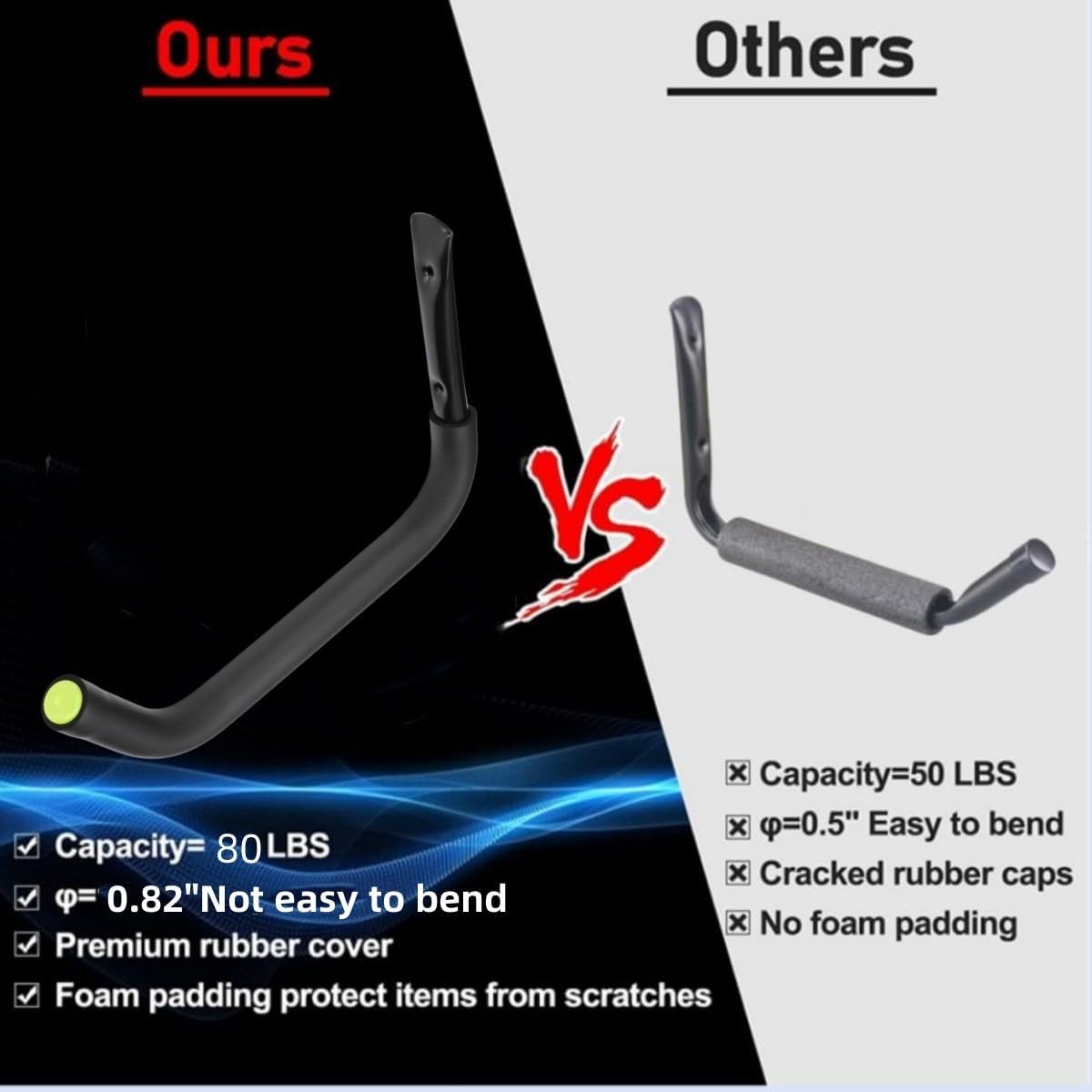 - 【 PACKAGE & BEARING CAPACITY 】6 sets “J” type wall mount garage hooks + 4 pcs nylon storage strap. Kayak storage hook size is 10-1/2 Inch x 15 Inch (38cm x 26.5cm). The diameter of the round tube steel is 3/4 inch (2cm). The maximum load-bearing capacity is 80 pounds.