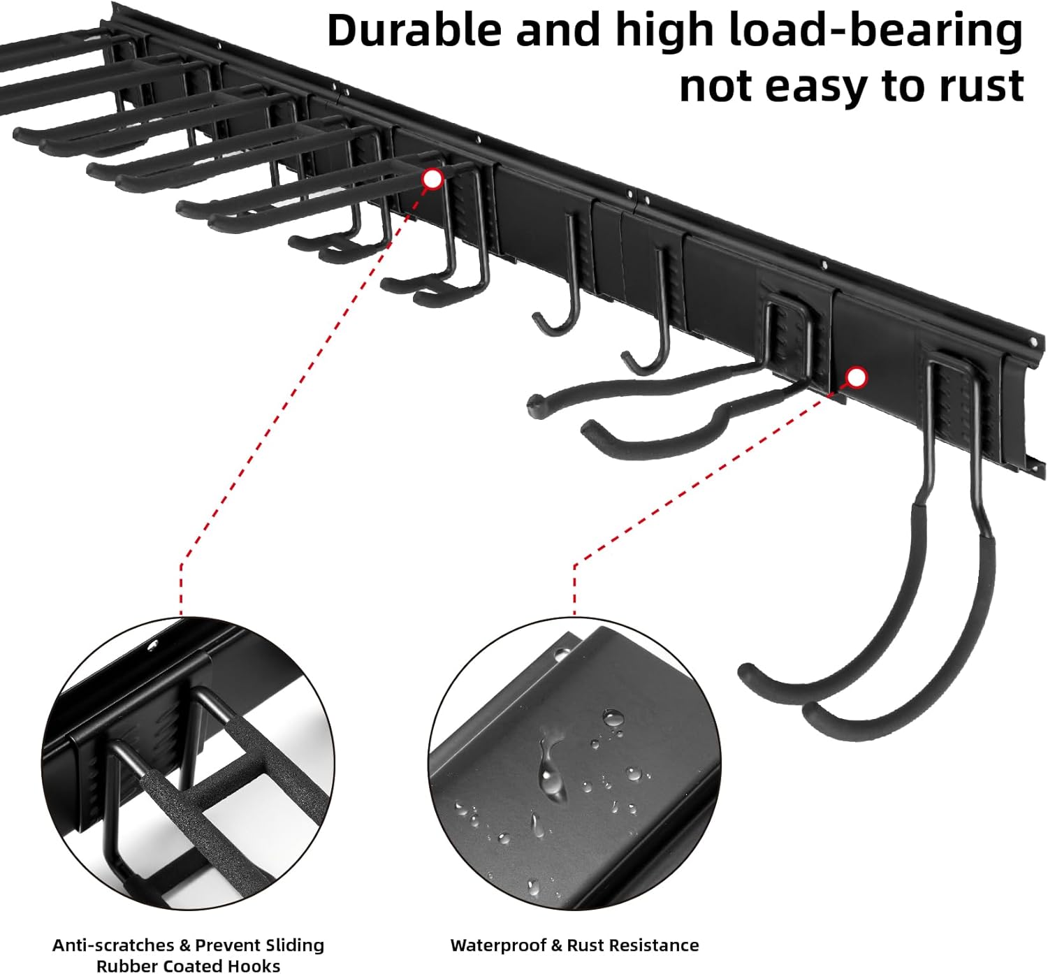 - This tool storage rack comes with 3 powder-coated rails with a total length of 48 inches. And 5 double long hooks, 2 small J-hooks, a power tool hook and long half-round hooks (for holding water hoses, heavy cables, etc.) and 2 heavy-duty straps. The double-layer steel hooks are each 10 inches long and the storage capacity is increased by one hundred percent.