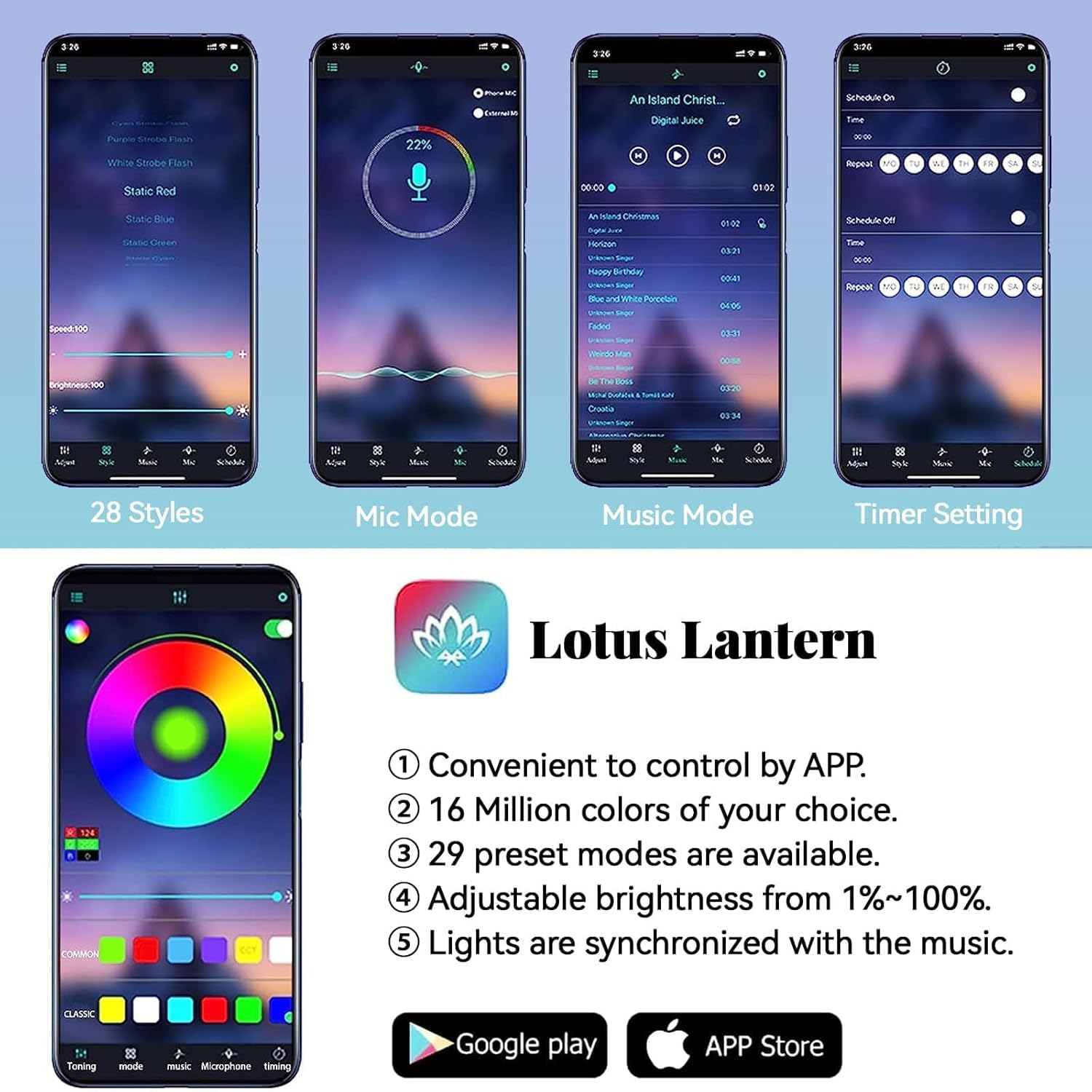 - Music Sensor: The LED car interior lights system is equipped with sound sensors that lets the car atmosphere light can sync any sound captured from microphone, then change colors following the music rhythm as well as your voice.