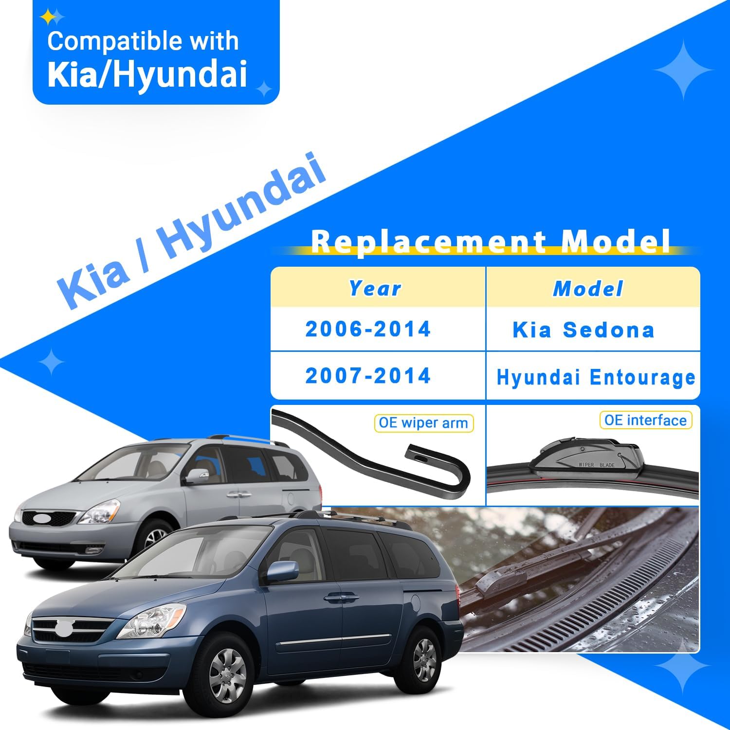 - {FITMENT1}: Replacement for 2006 2007 2008 2009 2010 2011 2012 2013 2014 Kia Sedona 26inch + 18inch front with 16inch rear windshield wiper blades.