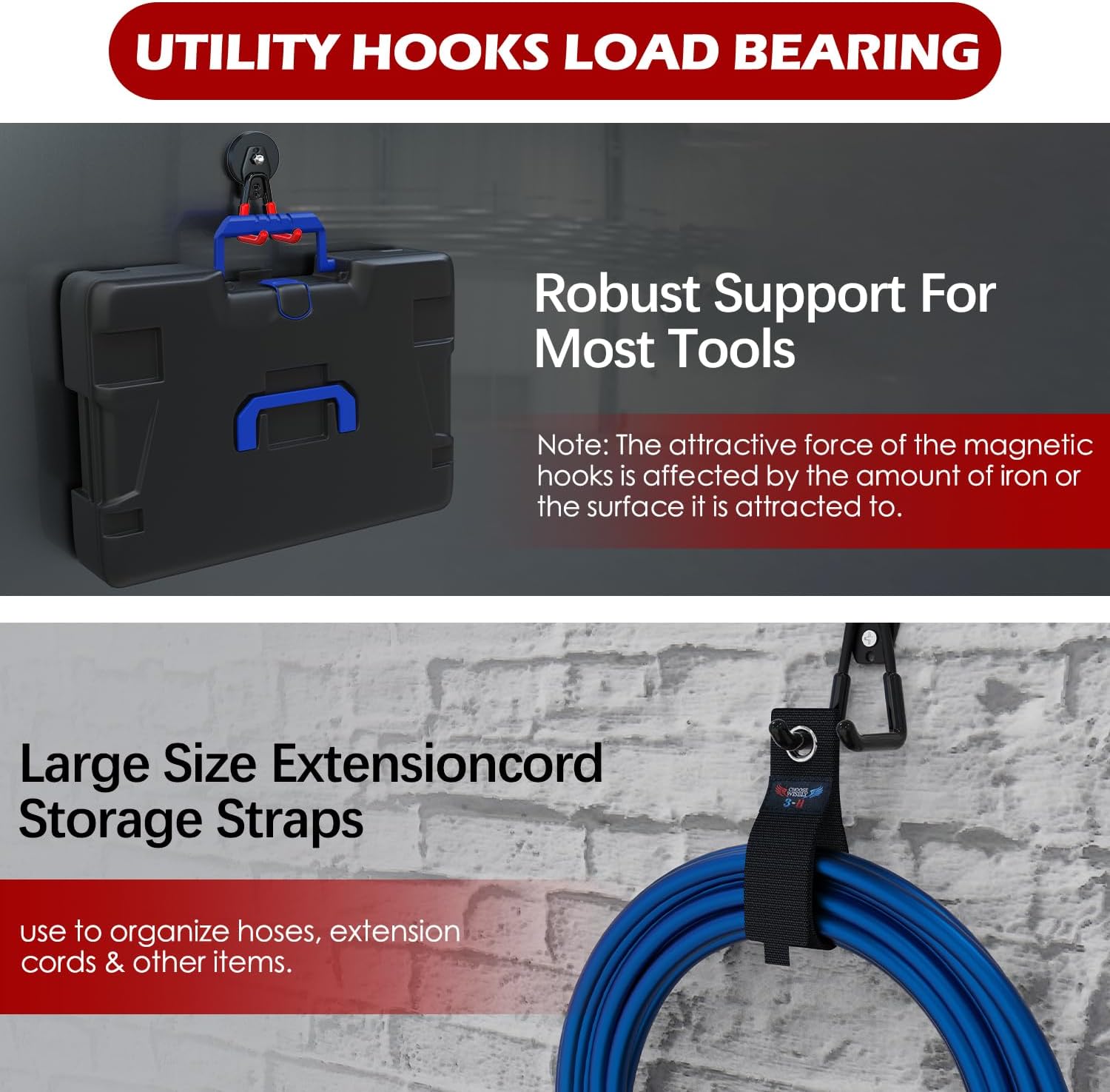 - Innovative No-Drill Magnetic Hooks: Eliminate the need to punch holes and effortlessly adhere magnet hooks to any metal surface, you can move them around as your needs change. The large magnetic hook has a dual-hook design for versatile use and can be separated into magnet and hook components. Our magnets with garage hooks heavy duty are coated with non-slip PVC and has protective sleeves to prevent scratches and rust