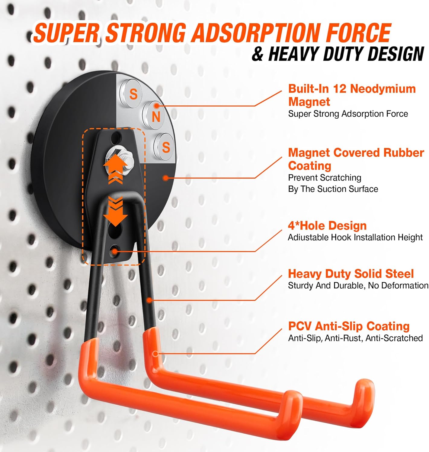 - 🧲[High Quality] The garage hooks with magnets are made of heavy duty steel metal material (we are increased the length of the hook), have strong load bearing capacity. Solid steel body adopts anti-rust coating and non-slip PVC sheath which gives better grab on hanging items and prevent them from falling or being scratched. The tubular double hooks design makes the heavy duty magnetic utility hooks more stable than regular single hooks.