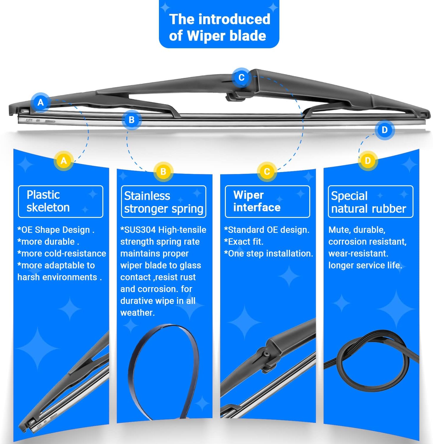 - {WIPER PERFORMANCE}: Natural rubber material making sure the wiping is the best, quiet wiping without judder or squeaking, resistant and a long service life.