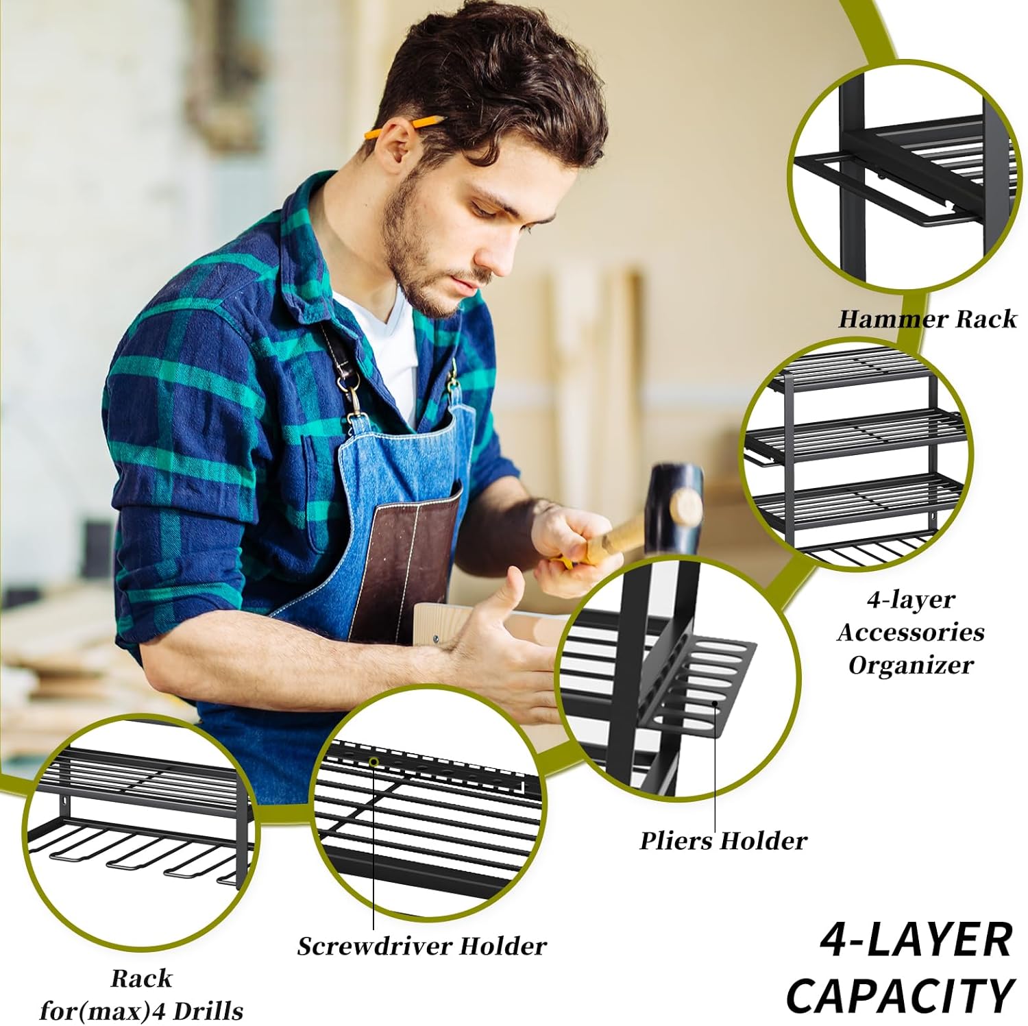 KAFAHOM Power Tool Organizer,4 Layer Drill Holders Wall Mount,Heavy Duty Metal Organizers and Storage Rack for Garage Organization,Tools Shelves with Screwdriver Plier/Hammer Holder, Black