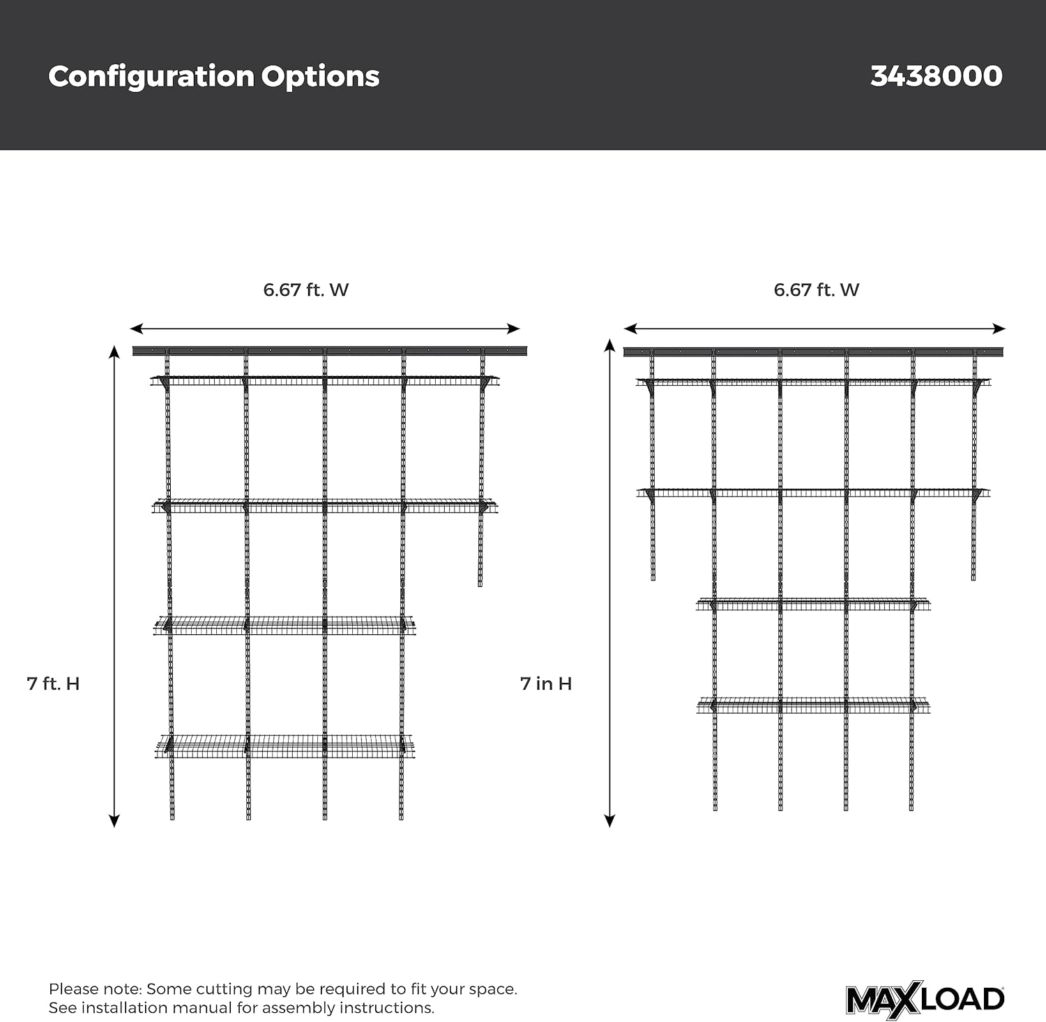 - HEAVY DUTY MAXLOAD SYSTEM: When installed per manufacturer’s instructions with weight evenly distributed weight capacity of 100 lbs. per foot of shelving; Ideal for storing storage totes, power tools, lawn equipment, home improvement supplies, sports equipment & more