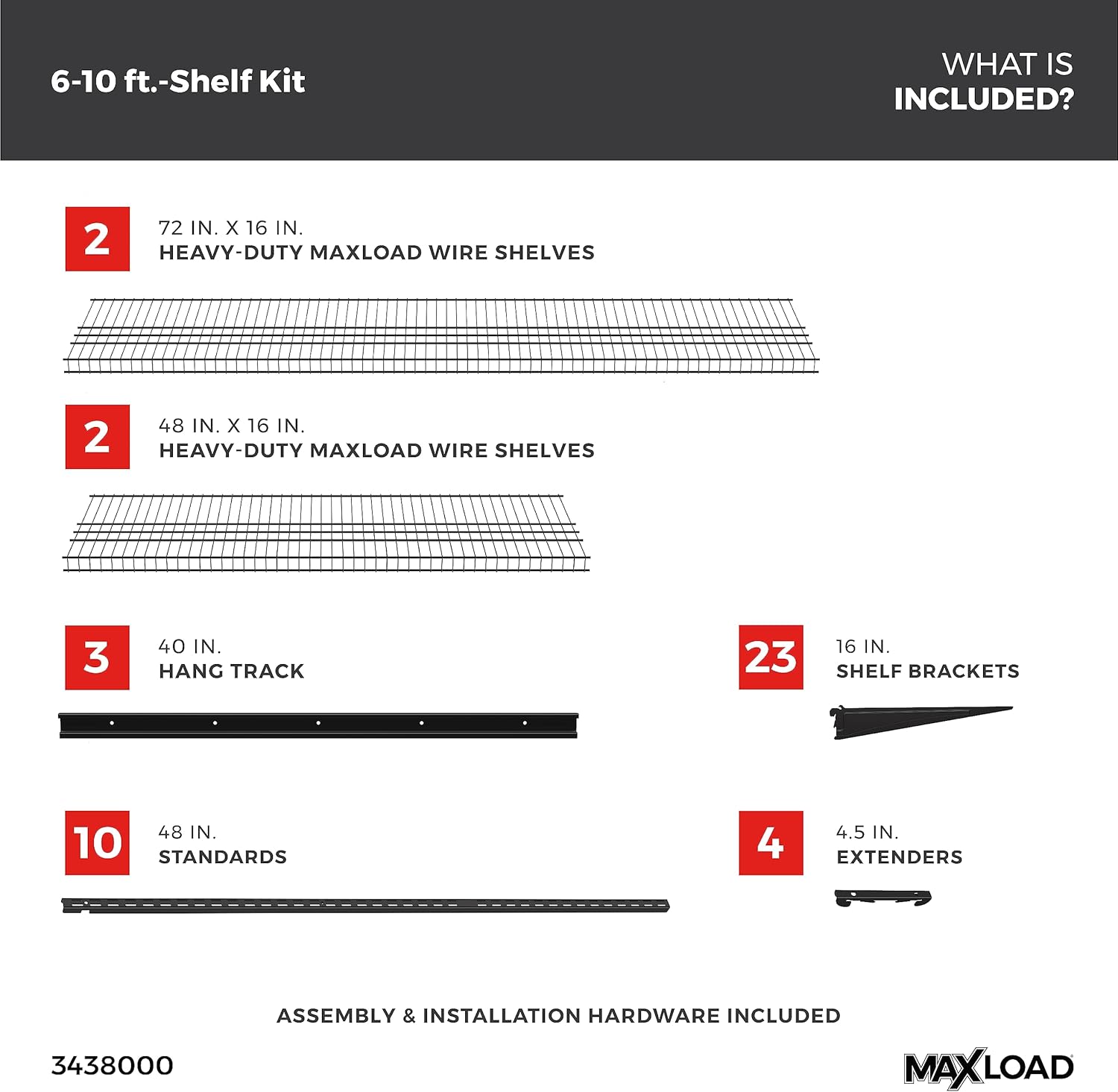 - ALL IN ONE SHELF KIT: Includes (2) 4 ft. W x 16 in. D & (2) 6 ft. W x 16 in. D MaxLoad shelves, hang track, standards and all hardware to install; Shelf kit ideal for organizing garage spaces or utility rooms with 5 different design configuration options