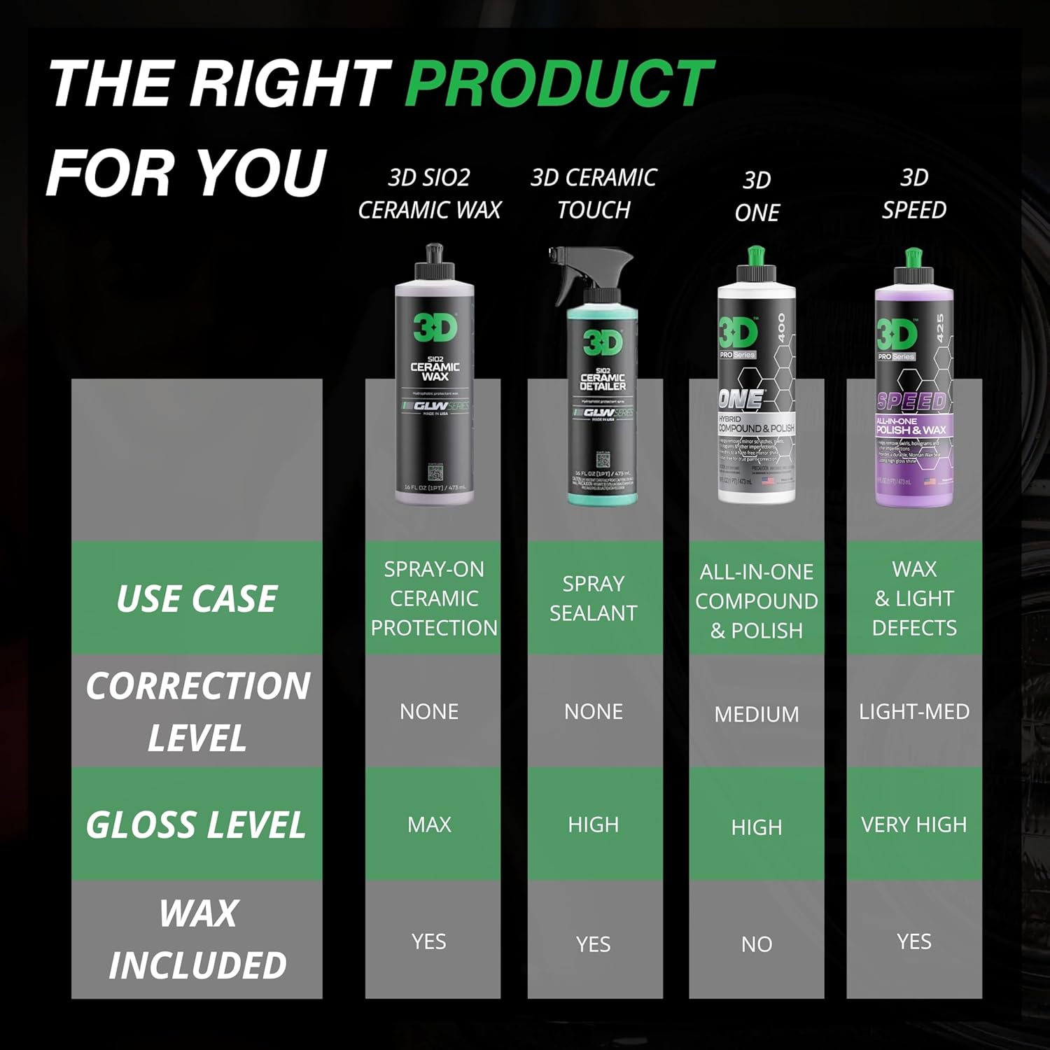 - Made In The USA & Designed For Detailers: 3D’s GLW Series is crafted in the USA with top-tier ingredients and cutting-edge chemistry. Whether you’re a weekend warrior or hardcore detailer, this wax gives your car that “showroom-ready” look without the hassle