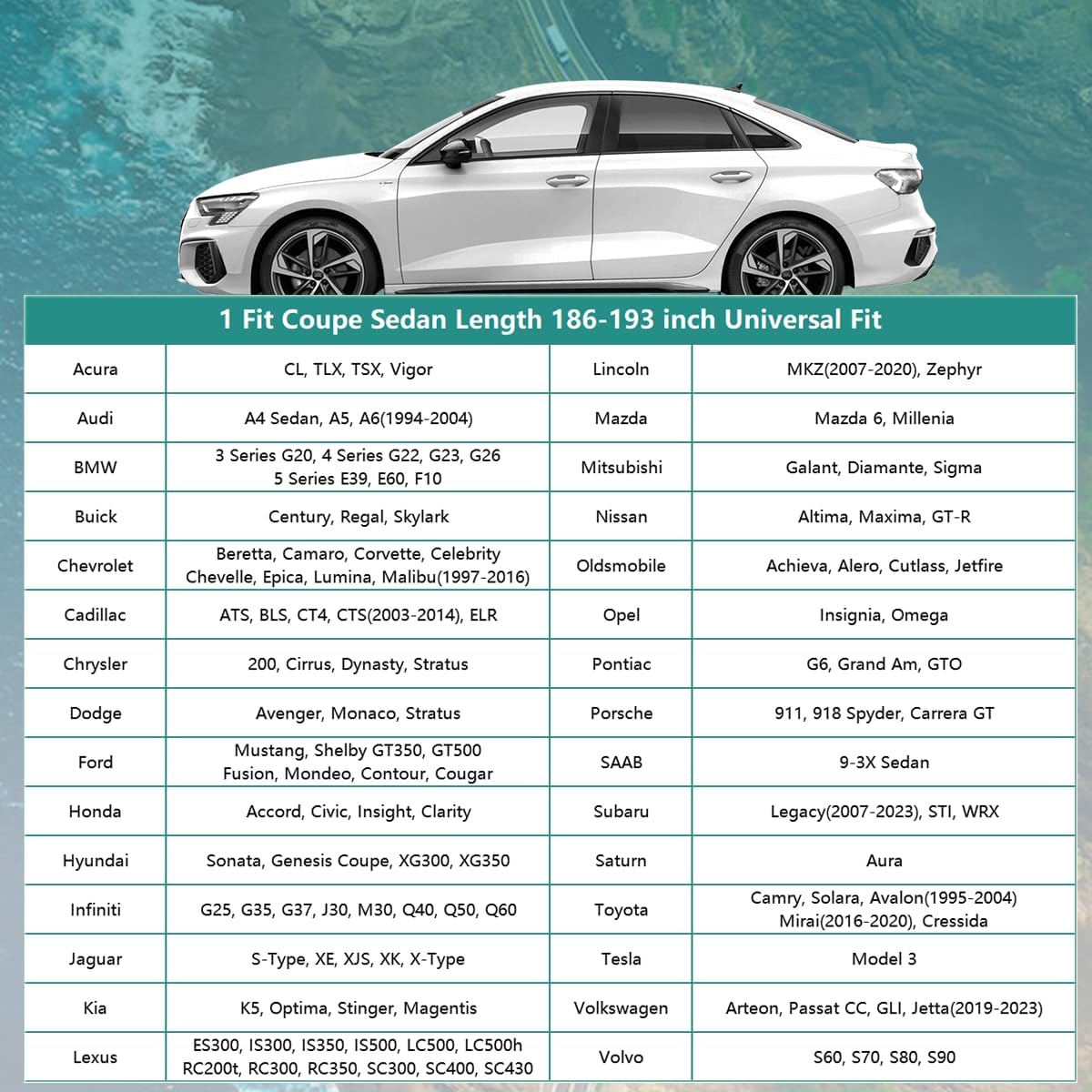 - 【Model Choice】GUNHYI automobiles cover is suitable for Coupe, Convertible, Length 186 to 193 inch (Not for SUV Hatchback). For exmaple--Chevrolet Chevy Camaro/Corvette, Ford Mustang/Shelby/Thunderbird, Toyota Camry, Honda Accord, Kia Optima, BMW 5 Series 525i, Cadillac Eldorado, Jaguar XJS/XK-Series, Mercedes-Benz C-Class/E-Class/SL-Class/SLS-Class, Lexus LC-Series/SC-Series, Bentley Continental, Mitsubishi 3000GT, Nissan GT-R etc.