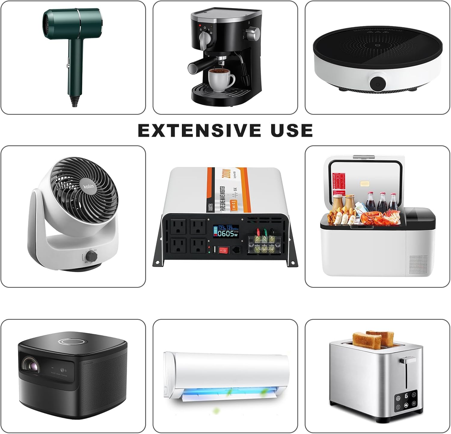 - SAFETY PROTECTION: The 2000W true sine wave inverter features advanced technology, safety design and all-round security protection to protect your devices. It has multi-protection against low voltage, over voltage, over load, short circuit and over temperature. The cooling fans start working when the inverter internal temperature reaches 113℉/45℃ or loading power around 50%, it keeping clean and lower the temperature.