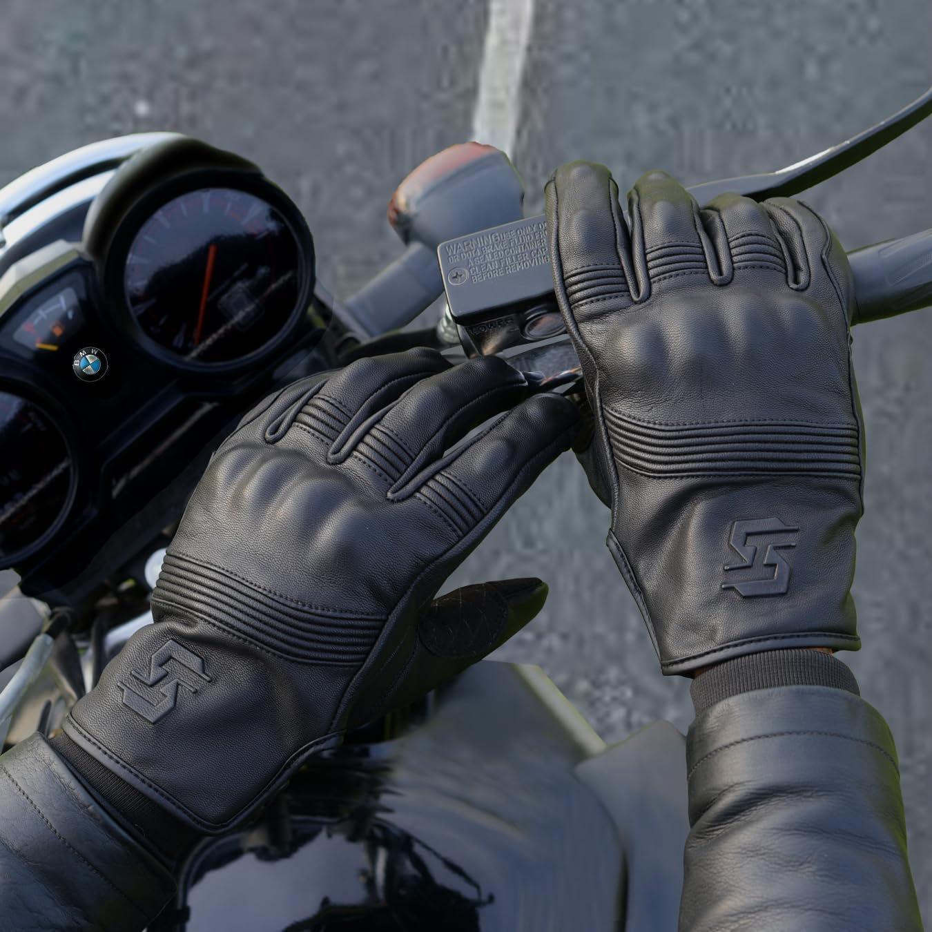 Leather Motorcycle Gloves for Men and Women | Touchscreen | Full Finger | Goatskin Leather Hard Knuckle Motorcycle Riding Gloves (Un-Perforated, Large)