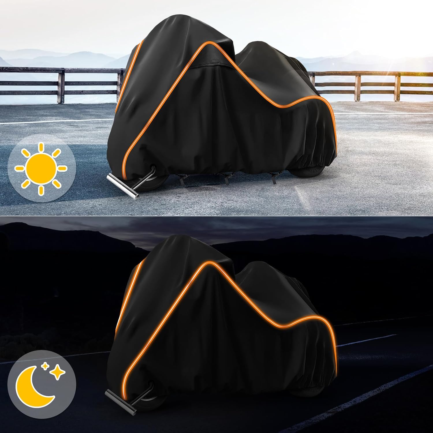 - 【Unique Designs】(1)Two air vents prevent moisture under the cover(2) Waterproof Black PU Coating: UV protection and heat-proof,prevent cracking and aging of inner decoration leather and plastic. (3) Two full Orange Reflective Strips to prevent collisions during the night and depict the body of your motorcycle with a chic look . (4) It comes with a “FRONT” sign, 2 antenna openings with Velcro, 2 Anti-theft lock holes(No locks) and a storage bag.