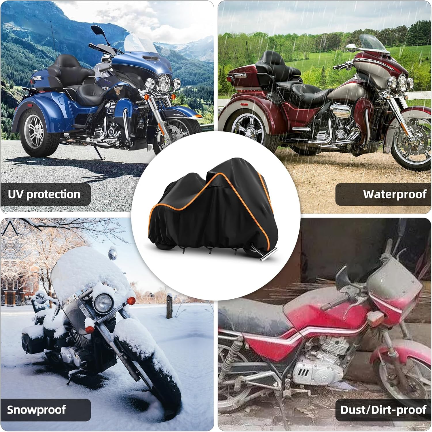 - 【Compatible with】The motorcycle cover compatible with the Trike Models including freewheeler, Tri Glide, and CVO Version, compatible with Goldwings, Chidftain, Challenger, Elite.Please make sure your bike model and the length before purchase and make sure your motorcycle body is dry and clean before putting on this bike cover.