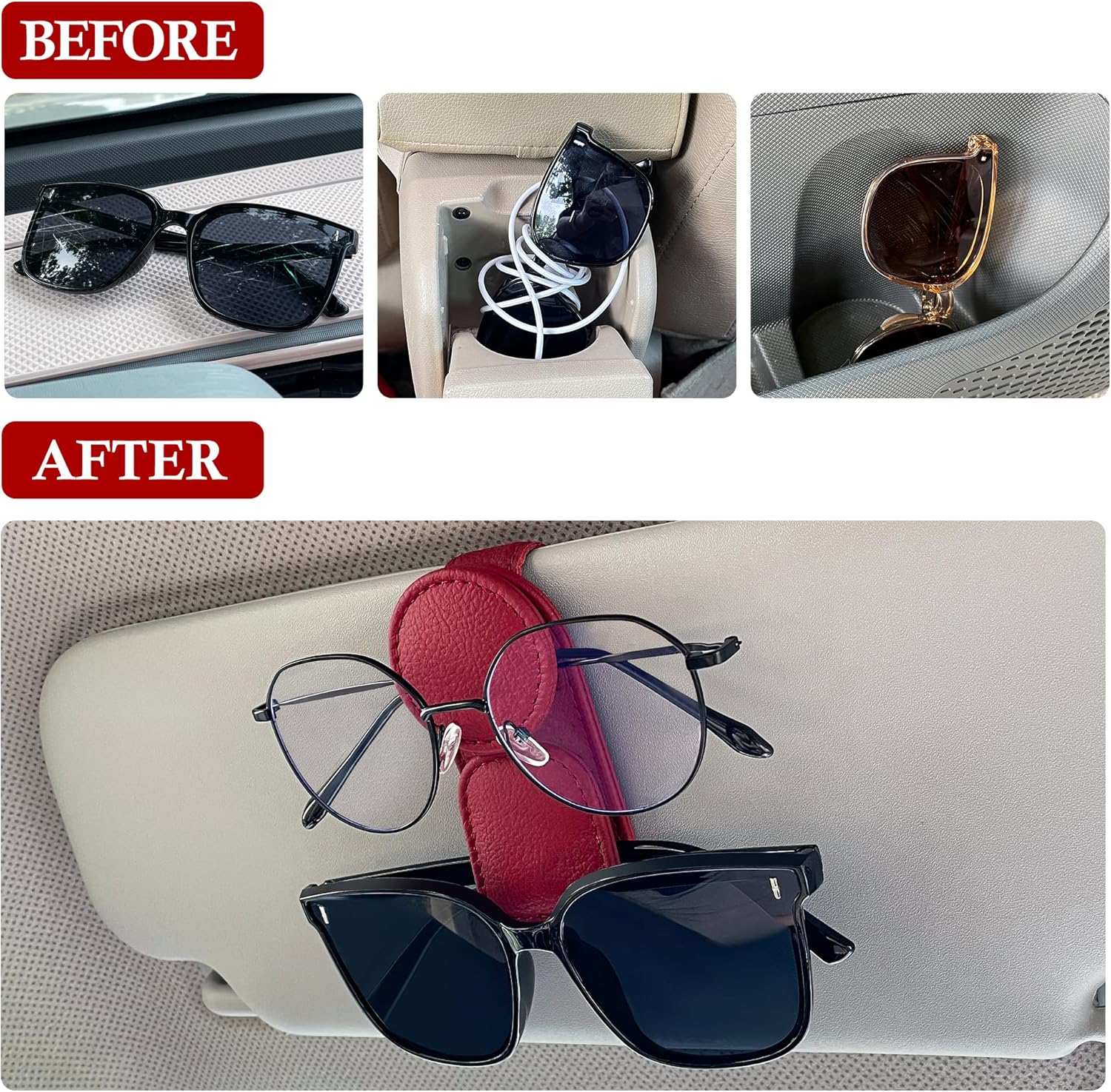 - Double Storage: This design can store 2 pairs of eyeglasses at once, fitting most types of eyewear, including sunglasses, prescription glasses, and reading glasses; enough space between clips to prevent from scratching each other for extra safety