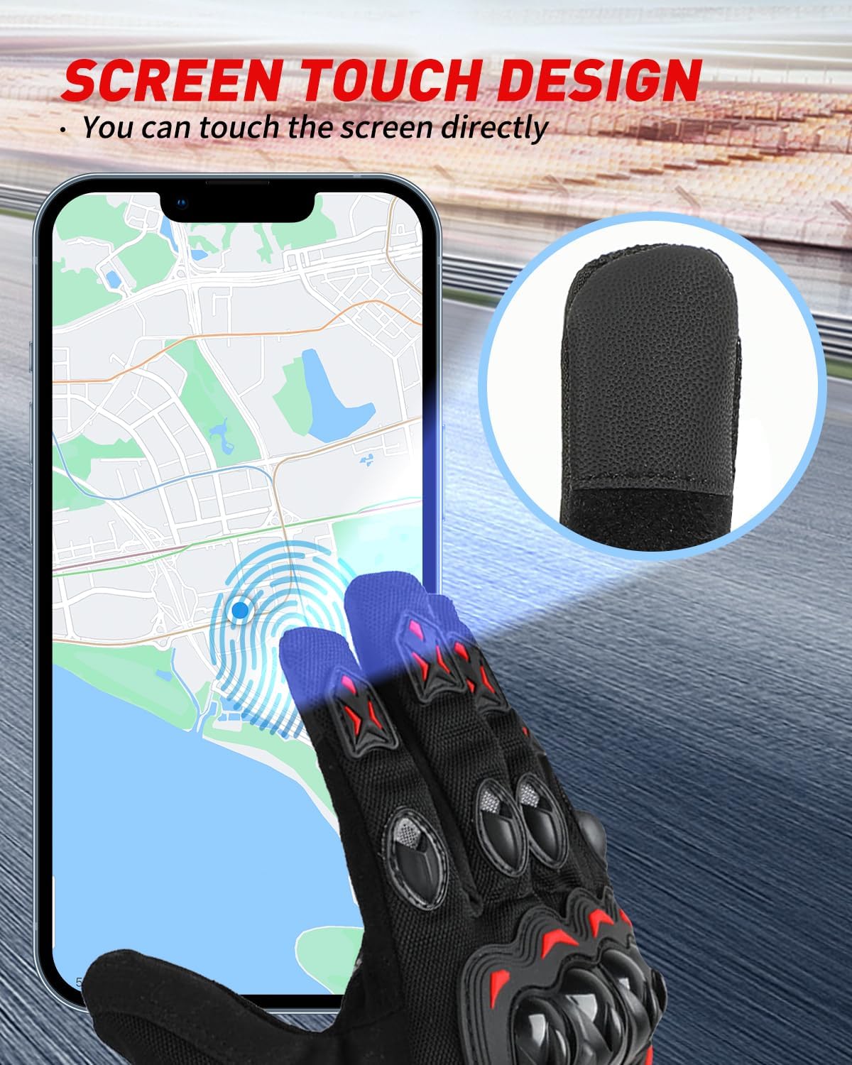 - 【Touch Screen Design】: Men's motorcycle riding gloves are design with touch screen function on the index finger,thumb,and middle finger tips. the gloves work with all touch screen devices in alll weather without taking off the glove.