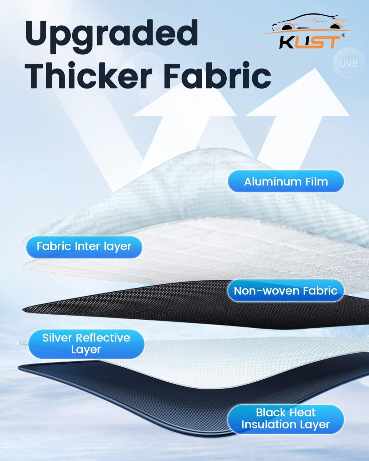 - 【5-Layer Thicker Quality Shade】Made of thicker and resistent reflective material,KUST Windshield Screen is thick enough to block 99.99% light and sun on a sunny summer day.Heavy duty and sturdy fabric , easily stays up in your windshield without crumbling.
