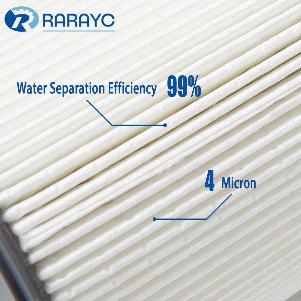 - Crafted from high-grade filter medium that provide maximum filtration and minimal flow restriction. Deliver increased flow and efficiency that are demanded in the diesel environment.This fuel filter can capture 99 percent of water contaminants,4 microns,ensure a steady flow of clean, dry diesel fuel for optimal engine performance.Double layer micro filter paper,the outer layer can obviously filter out the water in the fuel system to achieve water and oil separation.