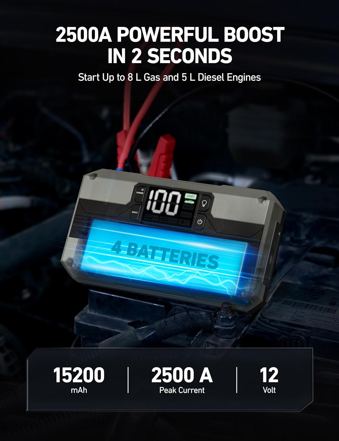 - POWERFUL BOOST IN 2 SECONDS: This car battery jump starter has 4 battery cells with a 2500 A peak current, capable of quickly starting low voltage and fully-drained batteries within 2 seconds. The built-in 15200 mAh battery can start up to 8 L diesel engine/5 L diesel engine and other 12 V vehicles like motorcycles, cars, pickups, trucks, etc. Ensuring you can safely adventure off-grid with peace of mind.