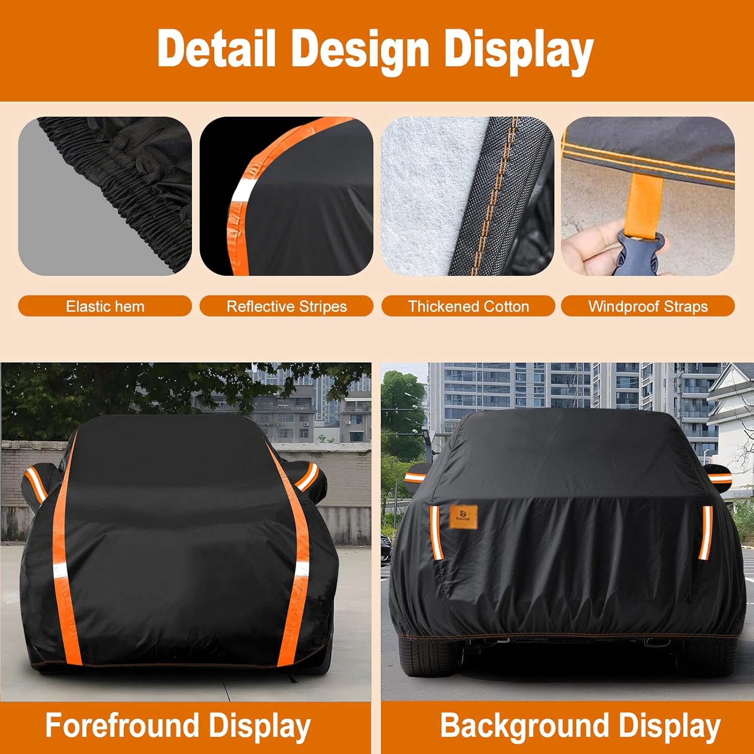 - 【Unique Design】Driver door zipper, Take something in the car will be more convenient. 4 Windproof straps at Front&Rear to prevent the cover from being blown away in heavy wind. 1 Storage bag , Store your cover easily when not used. For added safety, four reflective stripes enhance visibility at night, alerting others to your vehicle's presence. Mirror Pocket, Help you easily put on the cover.