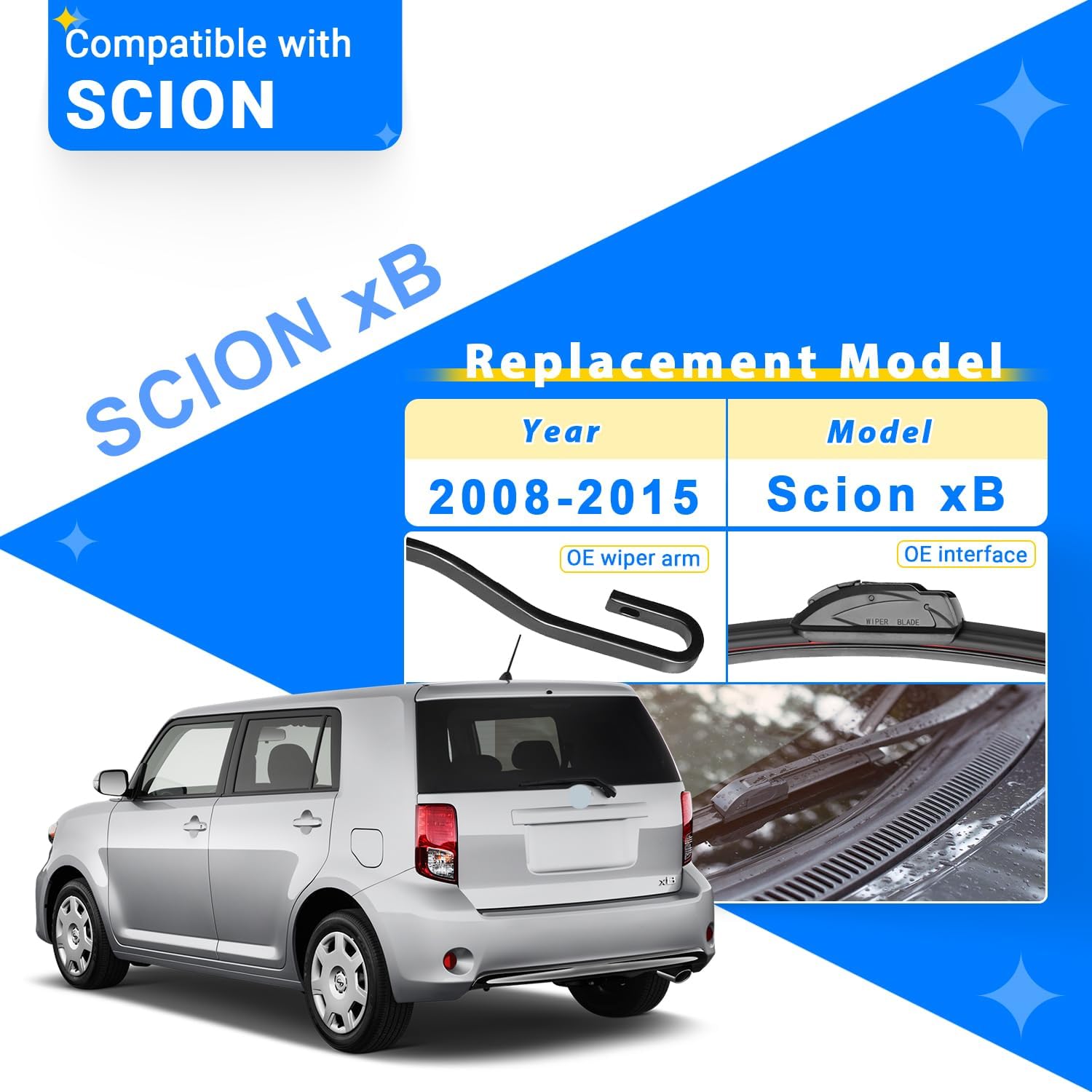 - {FITMENT}: Replacement for 2008 2009 2010 2011 2012 2013 2014 2015 Scion xB 22inch + 20inch front with 14inch rear windshield wiper blades.