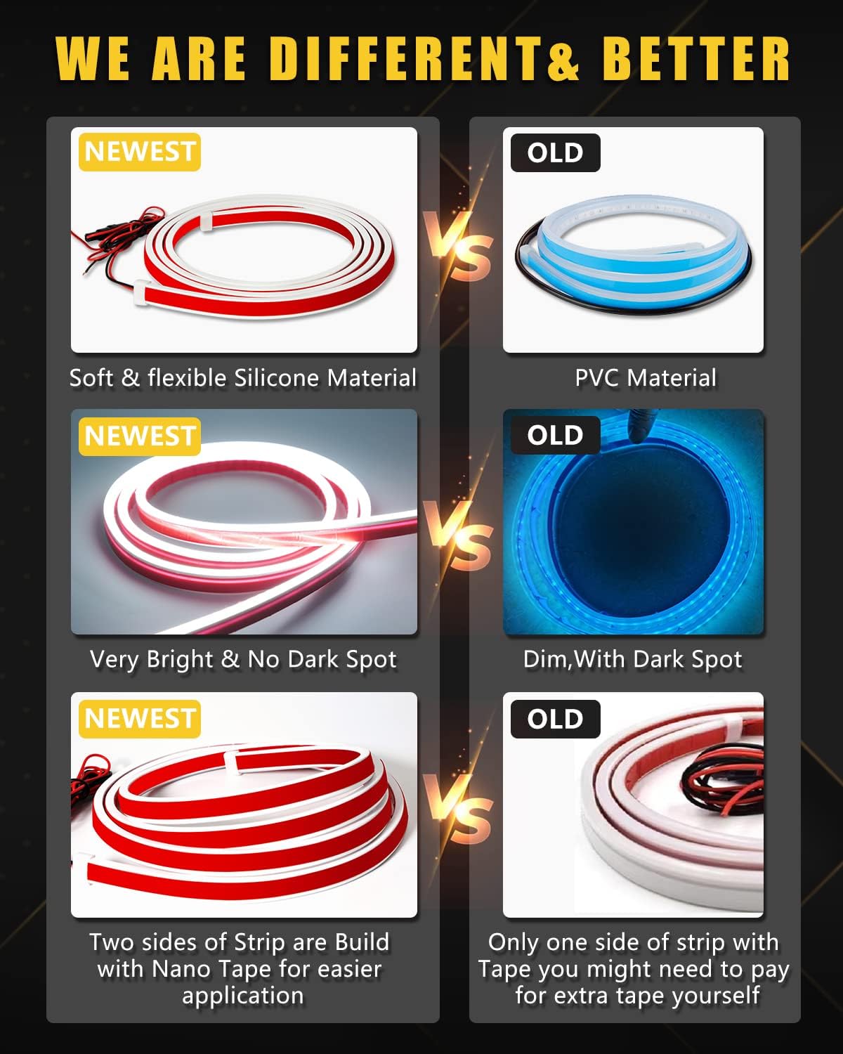 - 【Fuse Protection】The Car led strip light is made of soft silicone with heavy duty Nano Tapes on both sides,Super Bright,No dark Spots.Short circuit protection to enhance the safety.