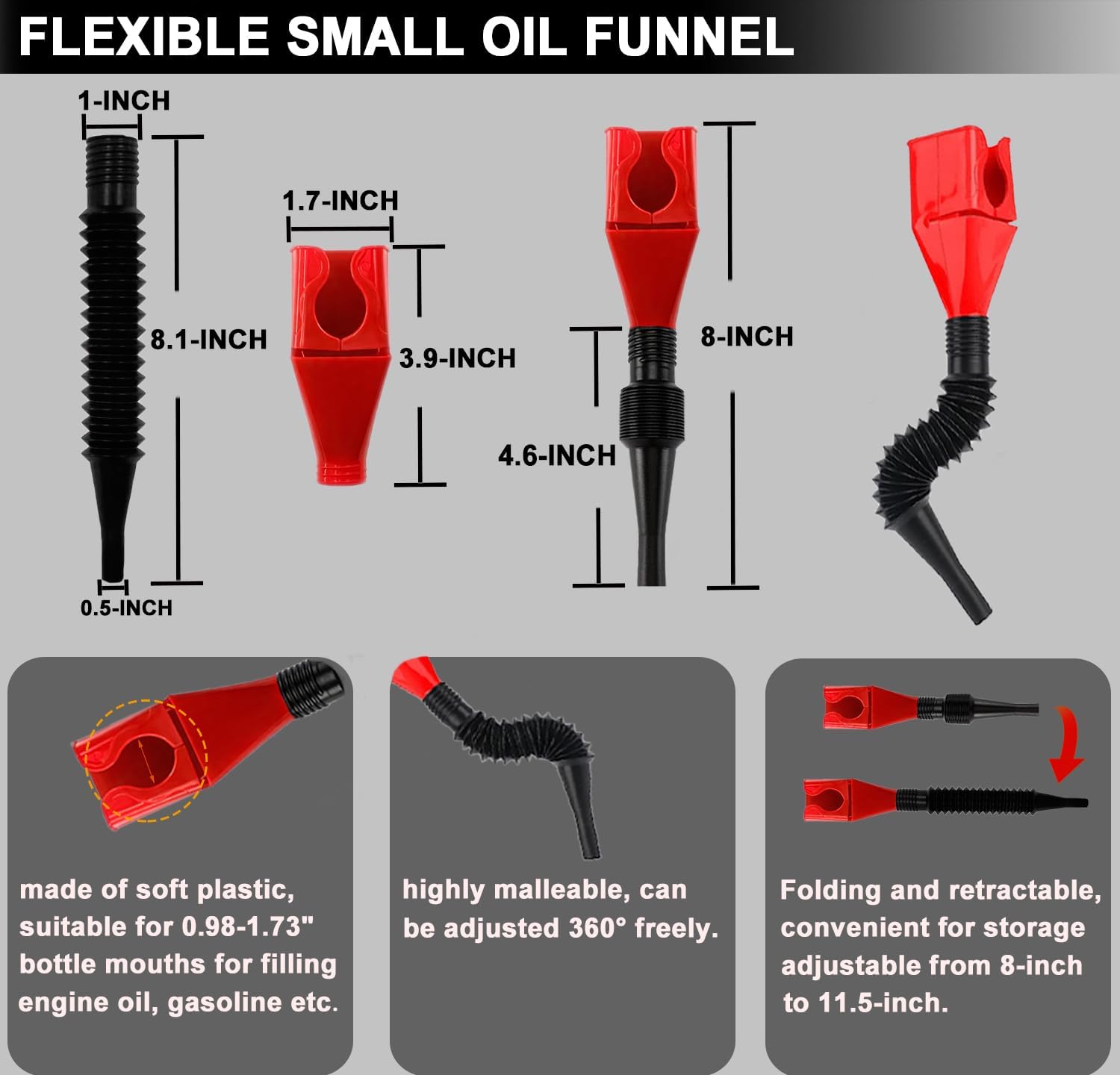 - Oil Filling Funnel: The oil funnel feature flexible, adjustable nozzles can be snap to 0.98-1.73" fuel bottles according to the user's specific size needs, can be easily clamped at the bottle mouth which fits for filling engine oil or gasoline or other fluids for car, truck etc.