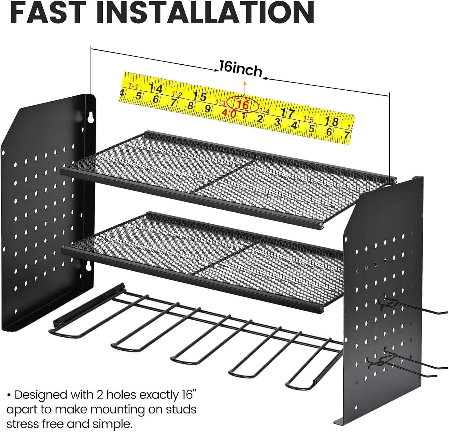 - Versatile Side Pegboards: Size 12"H×8.9"D, hang garage tools on pegboards with 4 included hooks, supports 0.25" pegboard accessories for DIY customization to increase storage space, improves load capacity and stability of the power tool rack
