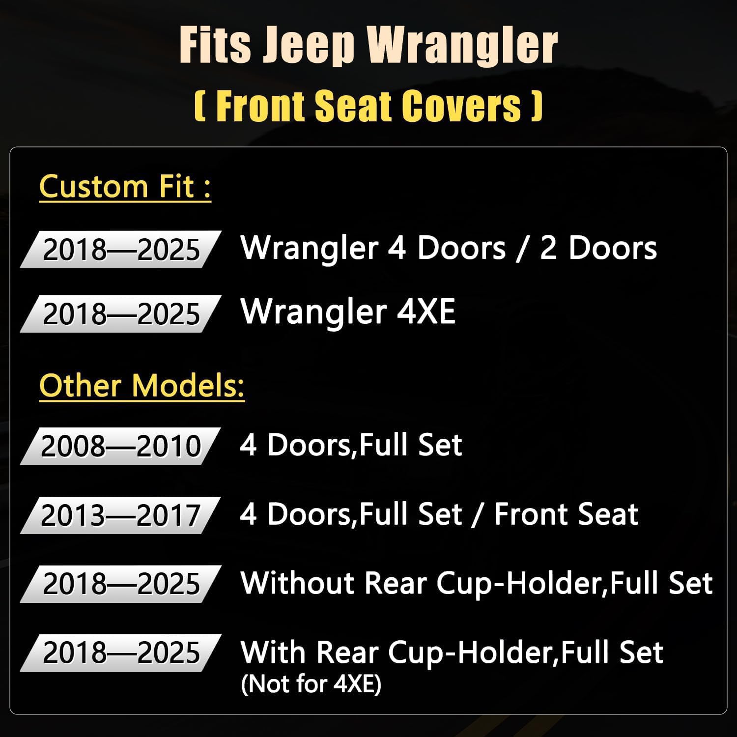 - 【CUSTOM FIT】 - Front seat covers customized according to the original car seat size 1:1, which will fit Wrangler JL 2/4 Door 2018 2019 2020 2021 2022 2023 2024 2025 like a glove.