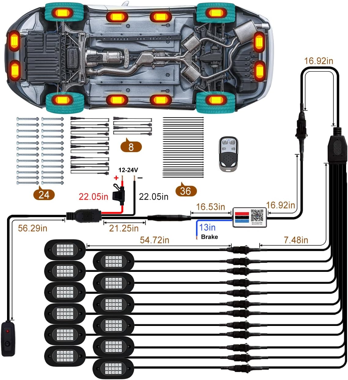 - [ Easy Installation & Widely Application ] ➤ Sacn QR code on driver box or user manul to download APP, the app is compatible with iOS 7/Android 4.3 or above, switch on phone bluetooth quick connect APP to setup lighting effect. Rock Lights can be widely used not only Off Road, 4X4, Motorcycle, ATV/SUV/UTV, Boat etc., but also in indoor, chassis lights, deck lights, ambient light, neon lights, etc. If you need an extension cable, please purchase the asin: B08VN4G4H3.