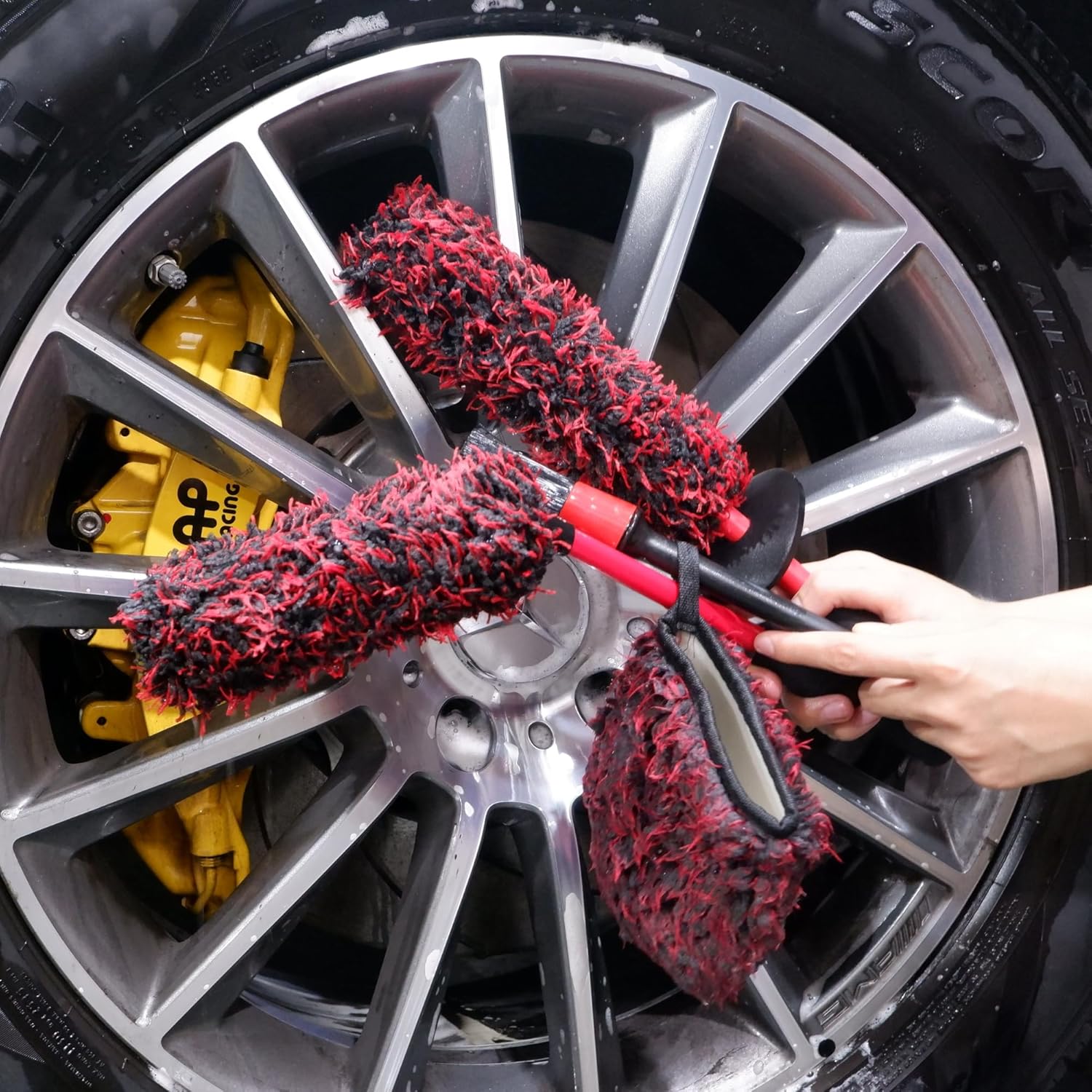 - 100% Non- Scratch Microfiber bristles and Non- Slip ergonomic Grip: Both wheel brushes features a new frameless design, covering fluffy microfiber incredibly soft yet dense . EVA foam Grip no slip grip that will not get slick even when wet hands. NO-slip grip along with interior finger loops to keep the wheel mitt in place