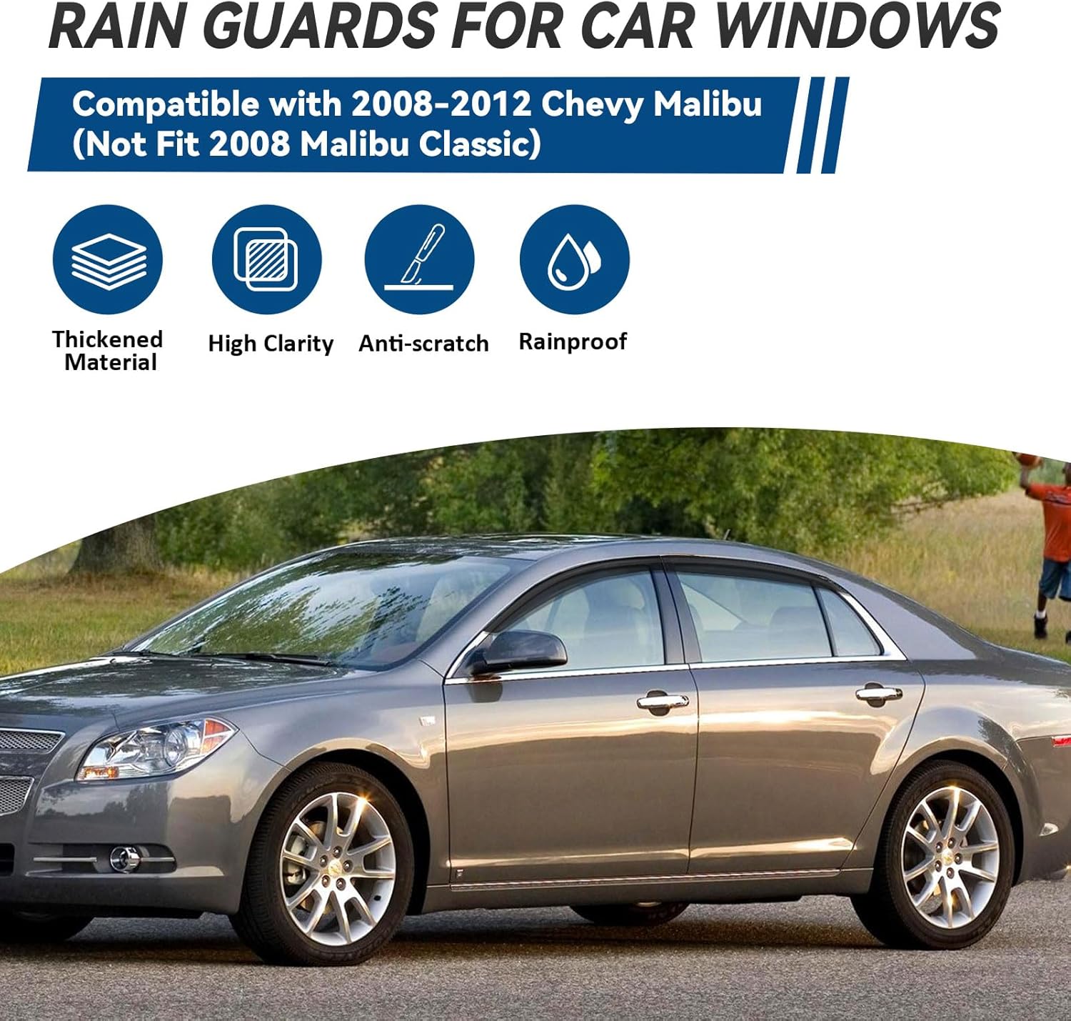Window Visors Sun/Rain Guard Compatible with 2008 2009 2010 2011 2012 Chevy Malibu 08-12 Malibu Front+Rear Smoke Tint Outside Mount Tape-On Vent Window Wind Deflectors