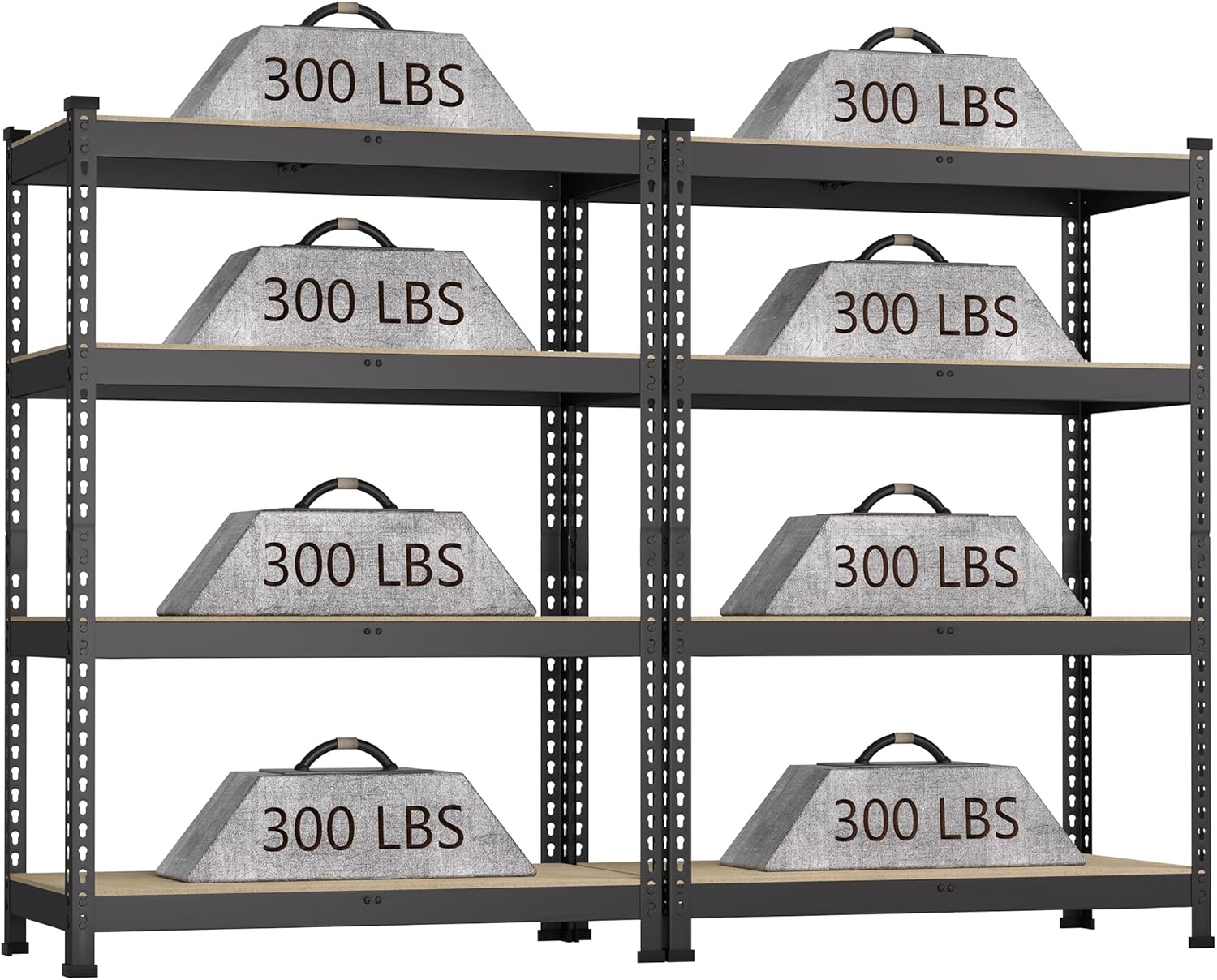 - - Size & Weight Capacity: Storage shelves' 1 pack size: 36" W x 16" D x 55" H. Built from the highest-quality metal, this garage shelving unit Max. load capacity is 300 lbs per layer shelf (evenly distributed) without buckling or breaking, 4 tier shelves' total max load capacity is 1200 lbs