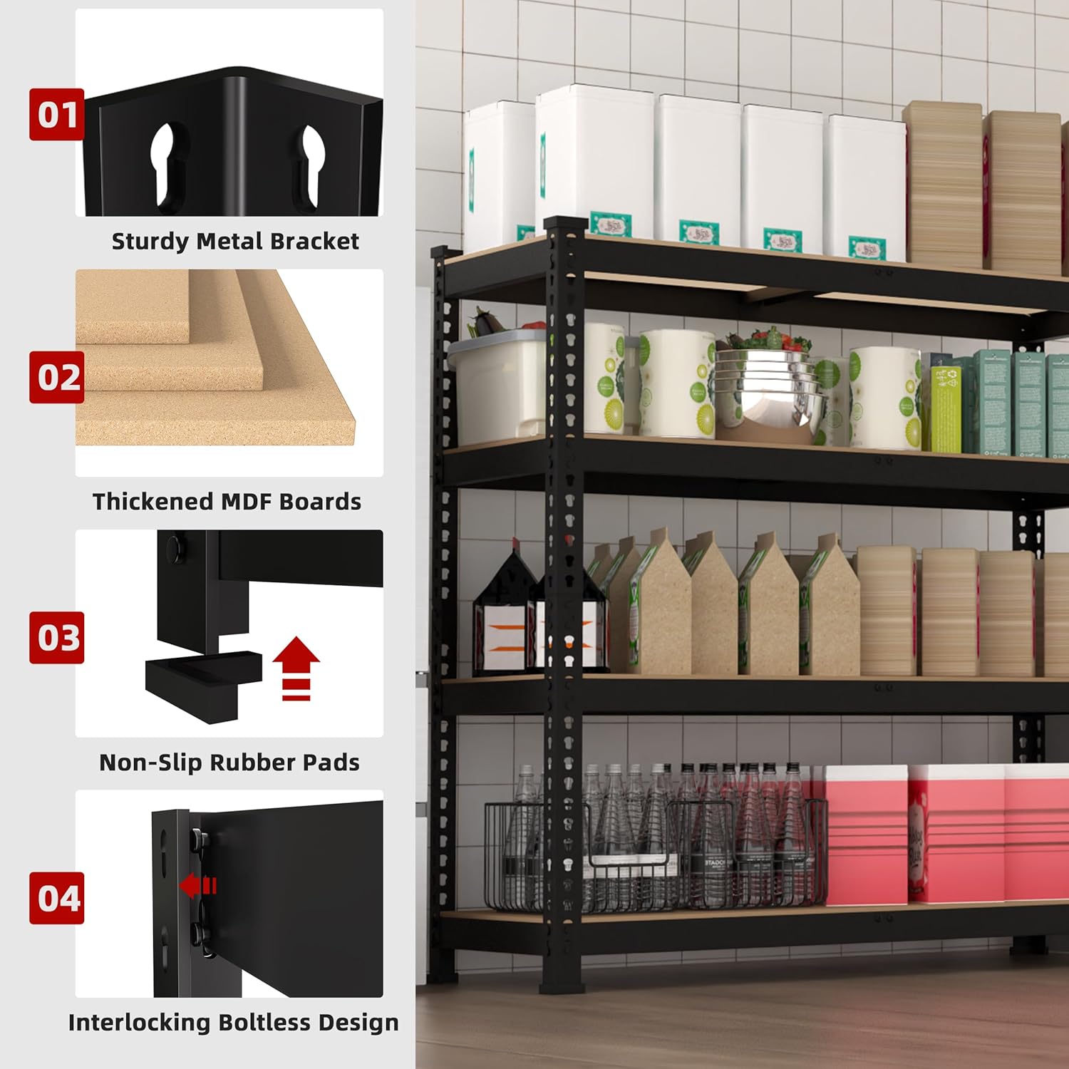 - - Quick and easy assembly: No need to pay a handyman or spend your Sunday afternoon struggling with screws, nuts, and bolts! This metal garage shelving rack comes with everything you need for easy and quick installation in just a few minutes(Including a rubber mallet and installation gloves