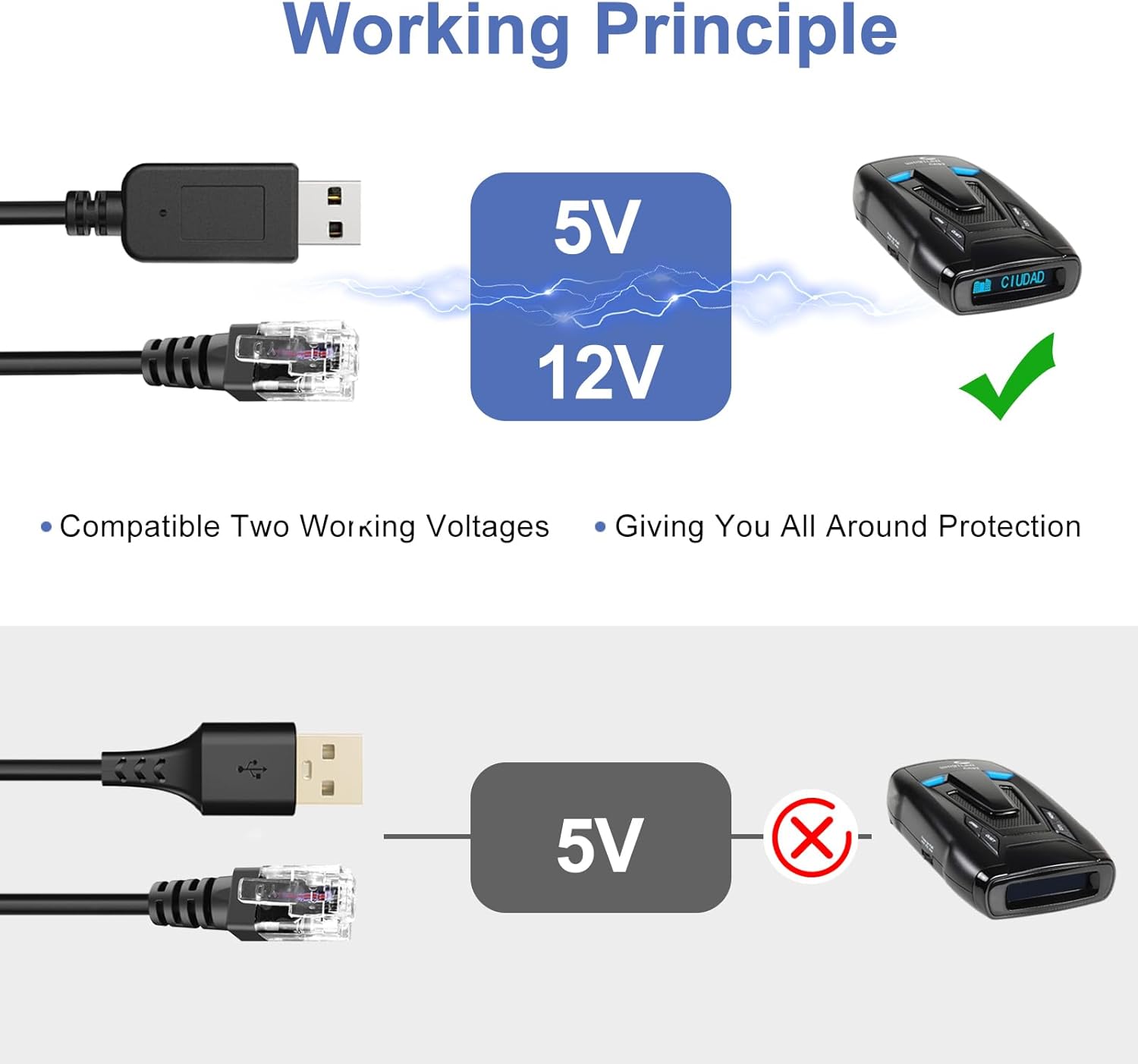 - Two Working Voltages:This radar detector power cable is compatible with two voltages(5V and 12V)and can successfully started the radar detector when connected to any USB A interface in the car