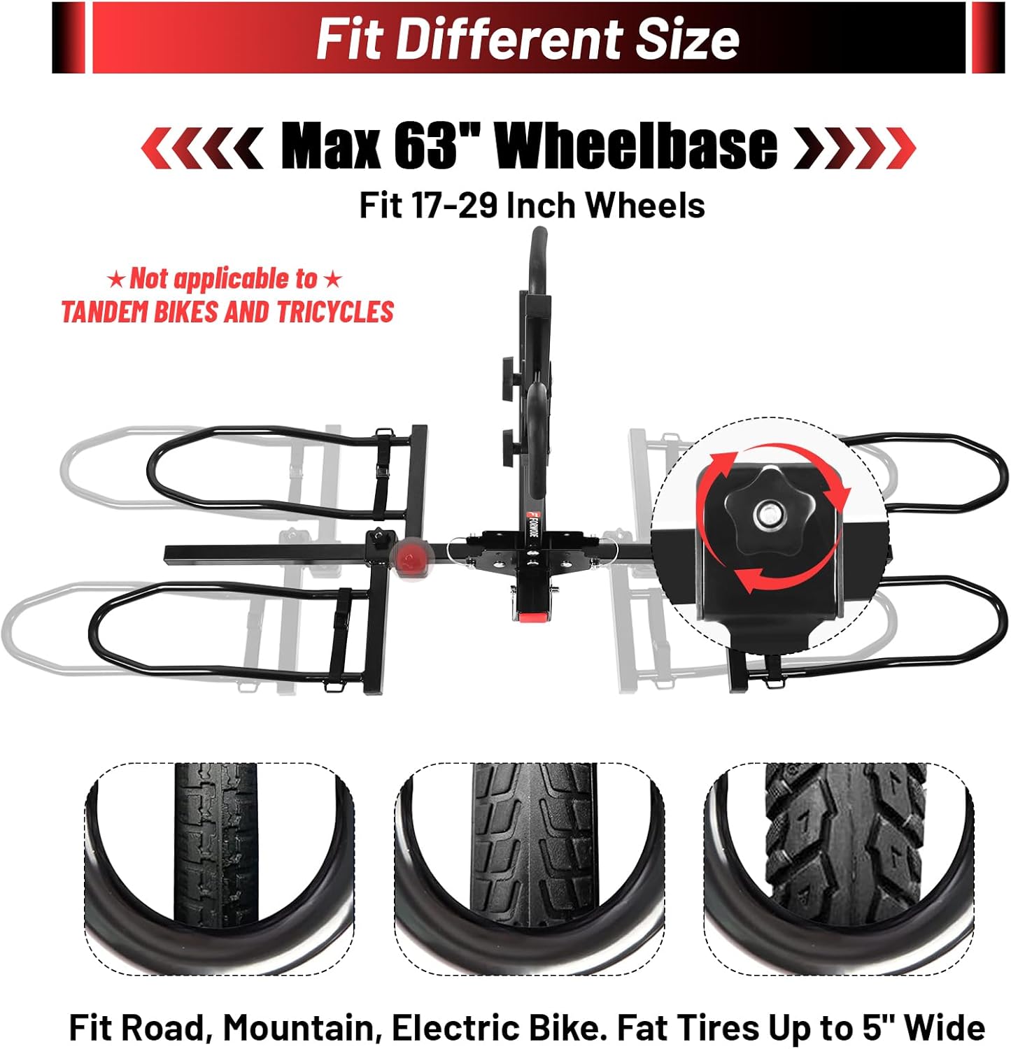 - HIGH COMPATIBILITY - Fits 17-29 inch bike wheel, max 63-inch wheelbase, 2-inch receiver, and up to 5-inch fat tire. Adjustable padded hook allows platform bike rack to fit a wide range of bikes regardless of frame, suspension