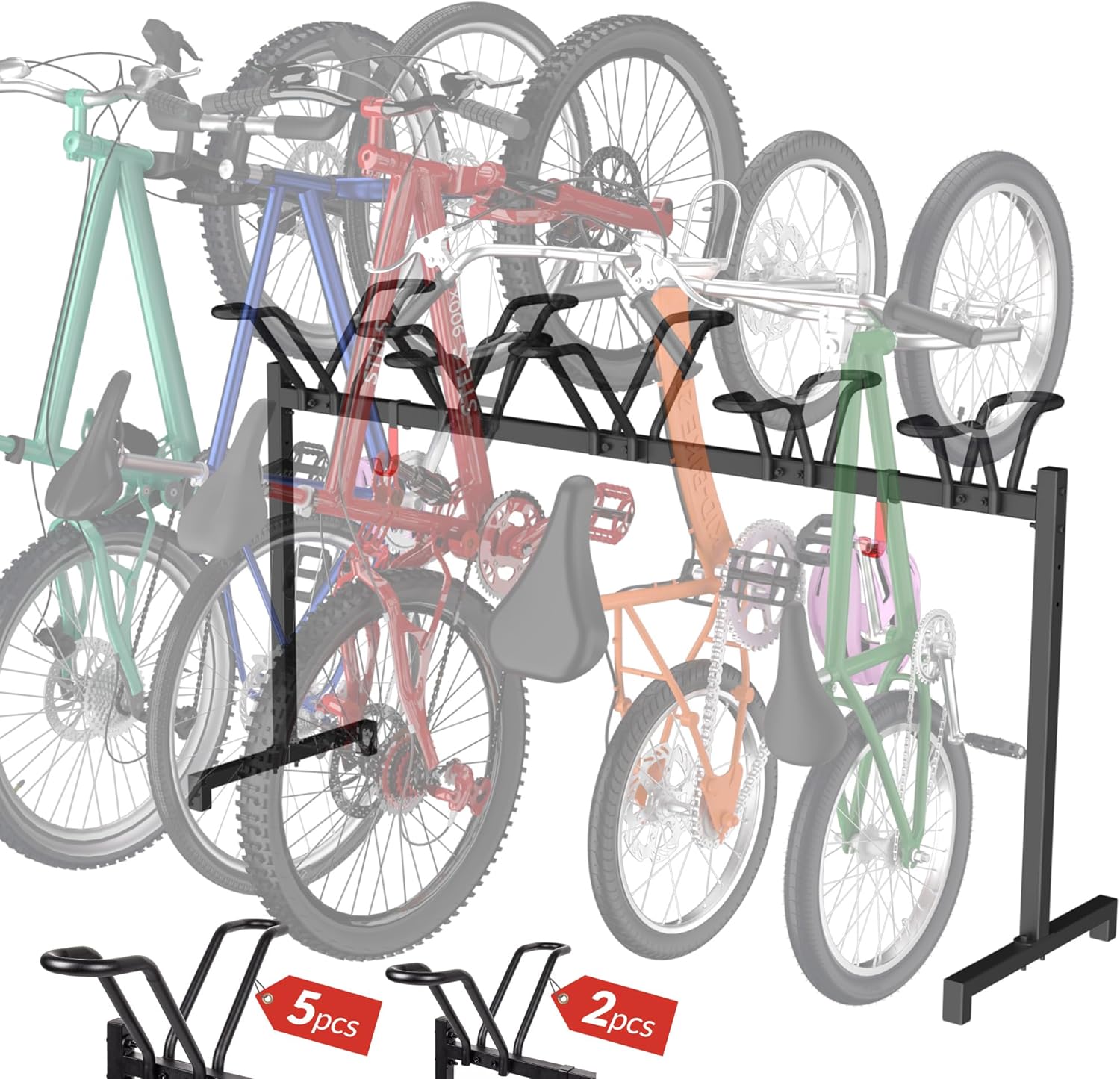 - Free Combination: Central Beauty of our bike rack is free combination. It comes with 7 V-brackets, 2 of which are additionally designed for kids bikes or adult scooters under 18". 5 larger V-brackets are suitable for adult bikes up to 2.5" tire width. According to your needs, you can freely combinate these brackets to achieve the effect of "a multi-purpose" . The rack can comfortably fit 5 bikes, great for most kinds of bikes, including road bikes, mountain bikes, hybrid bikes and kids bikes.