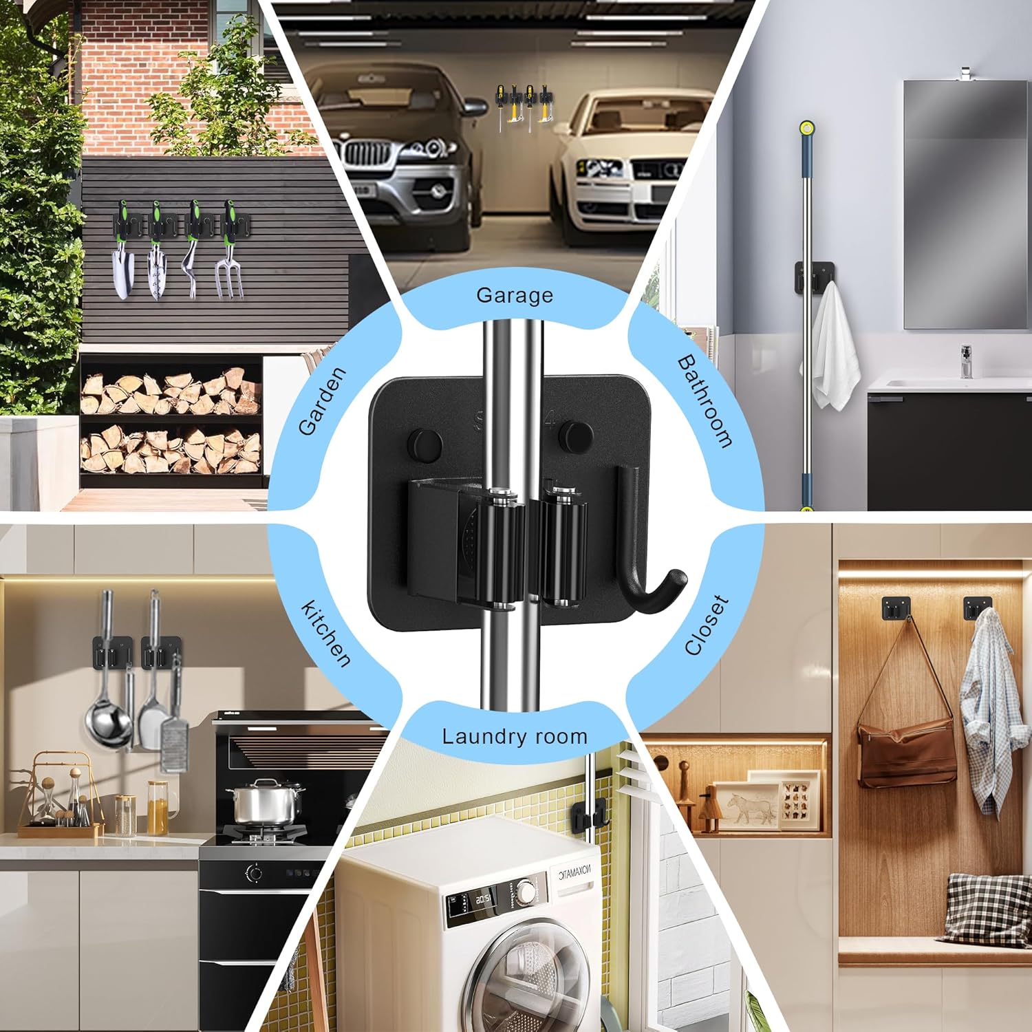 - 【Extremely Utility Rack】New Version broom hanger is a good organization tool in the closet, garage, kitchen, bathroom, laundry room storage. Not only for hanging mops and brooms, but also for hanging various small things, such as repair tool, umbrella, kitchen supplies, toilet brush etc.