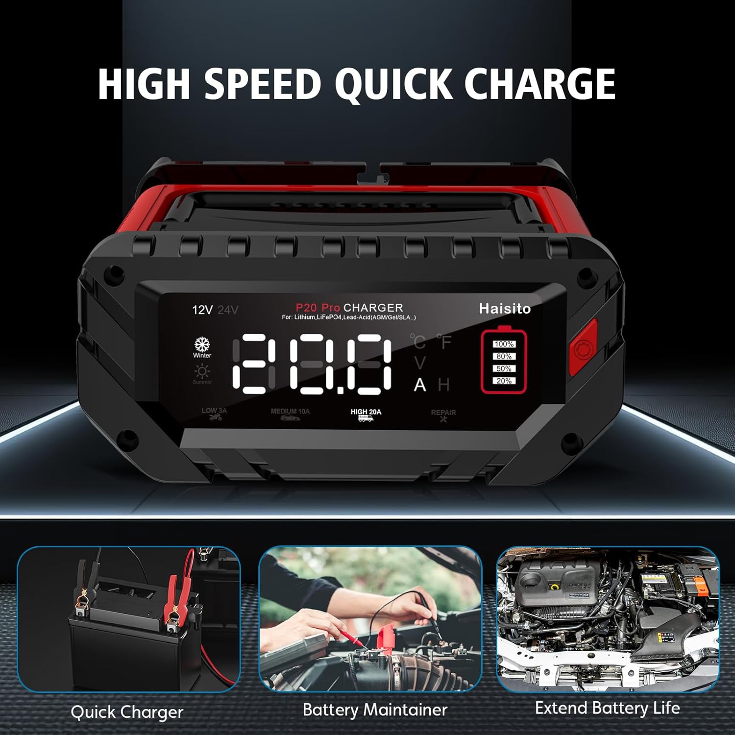 Haisito 20 Amp Lithium Battery Charger, 12V and 24V Lifepo4,Lead-Acid(AGM/Gel/SLA..) Portable Car Battery Charger,Battery Maintainer, Trickle Charger, and Battery Desulfator for Car,Boat, H-20-PRO