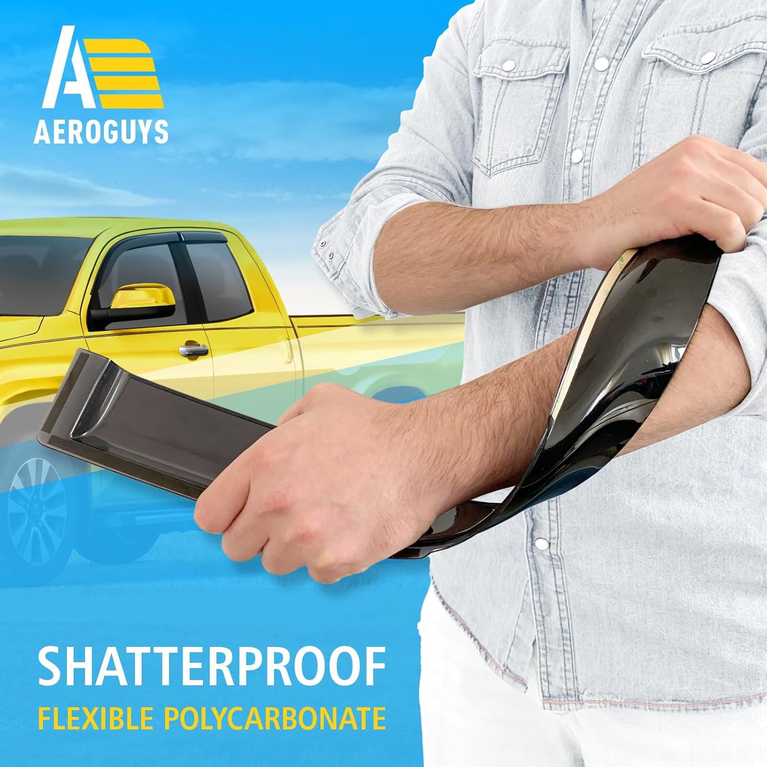 - No Tools Needed, Quick and Easy Assembly – These rain guards are very easy to fit. TAPE-ON INSTALLATION provides perfect fit for your truck. Just slip it onto your car’s window and your job is done within minutes. There is no drilling or no tools required. Be sure that AEROGUYS window deflectors are water resistant, sun protective and will not bend, break or crack regardless of the weather conditions.