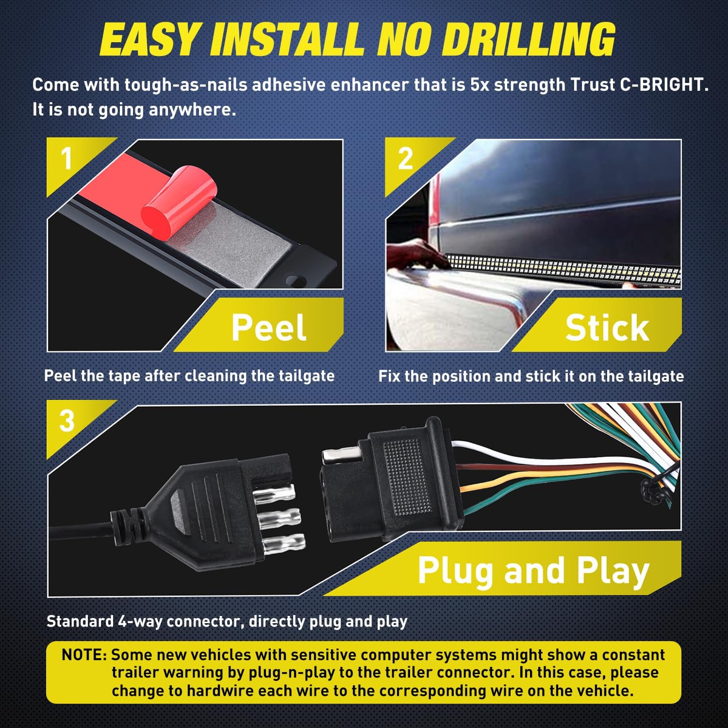 - Widely applicable: this tailgate Light Strip is 48 inches long and is suitable for most pickups, trailers, truck, towing vehicle, cars, SUV, RV, Van, etc. NOTE: If there is a warning when plugging into the trailer port, please connect the car light wiring follow the line sequence