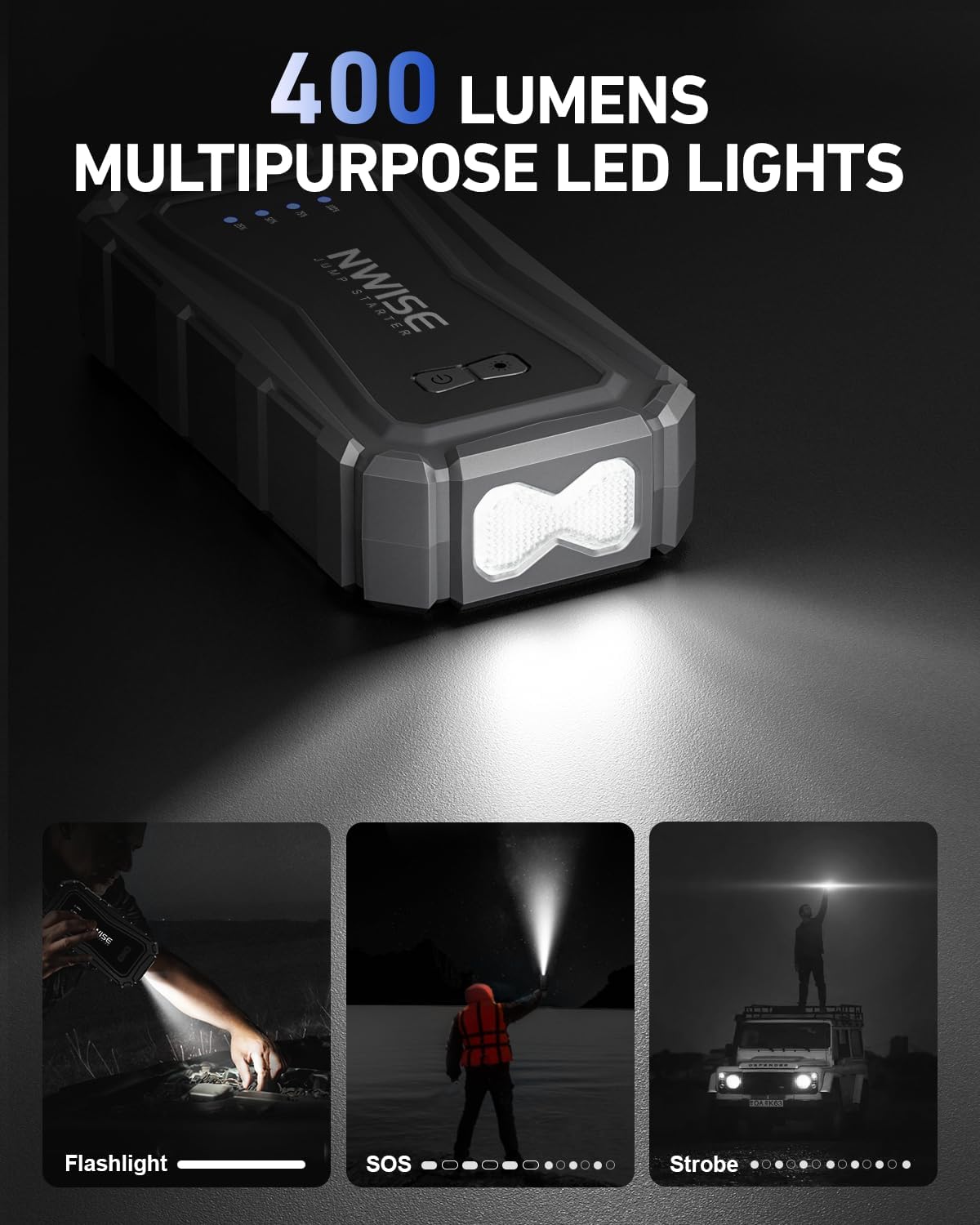- 【More than a Jump Box】HJ-180 jumper pack equip super bright LED light which support 3 modes(Solid,Strobe , SOS). It is useful in many situations, such as checking for engine failure at night, outdoor adventures / accidents, calling for help, warning of other vehicles, etc.